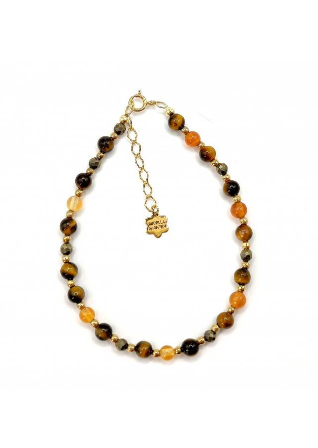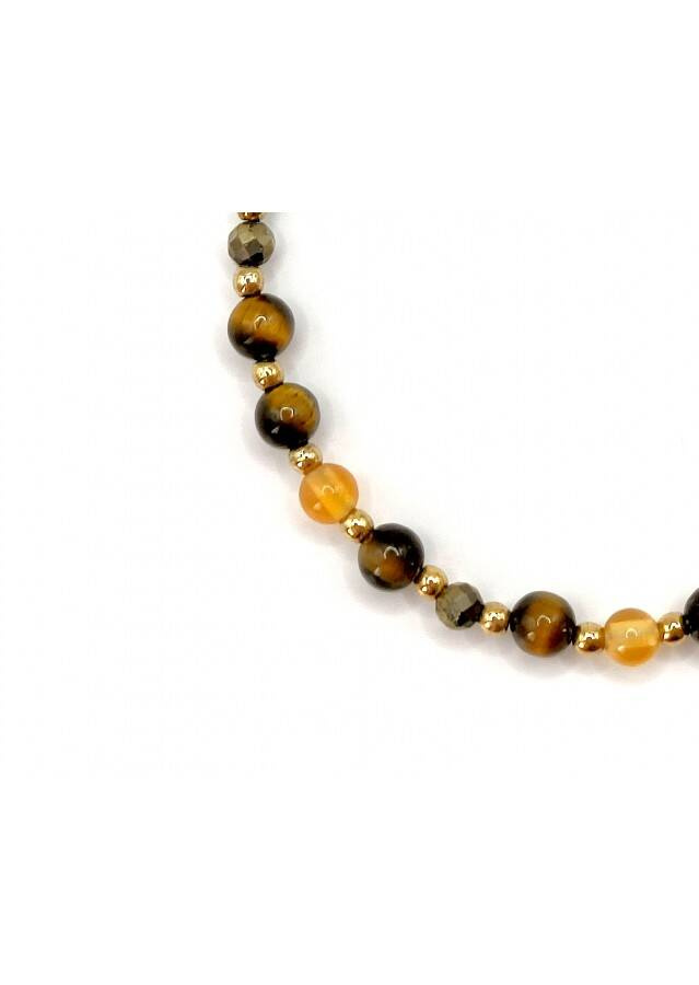 Bransoletka wykonana ze srebra próby 925, pozłacanego 24 karatowym złotem Kamień: Tygrysie oko + Piryt + Kamień słoneczny i Hematyt Rozmiar kamienia: 4/3/2mm Długość: 17,5 cm Zapięcie: federing Bransoletka może być wykonana na gumce- prosimy o informację w uwagach do zamówienia Biżuteria ręcznie wykonana, produkt Polski.