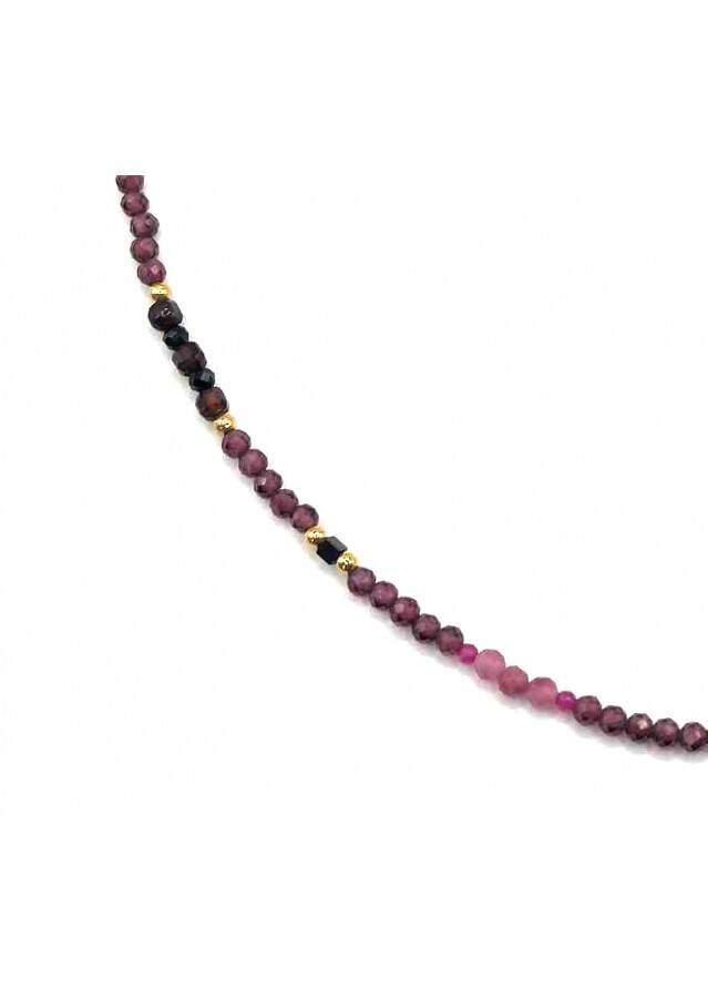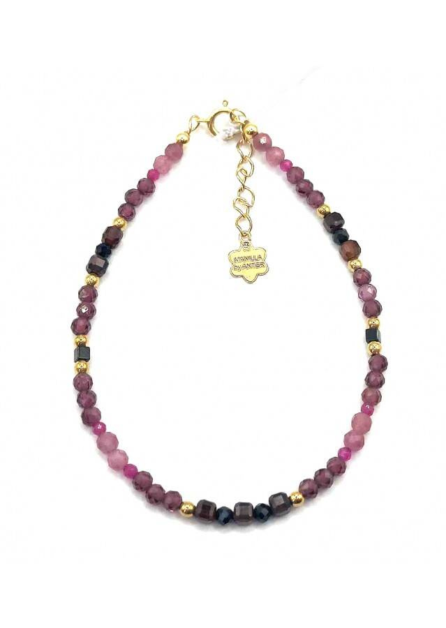 Bransoletka wykonana ze srebra próby 925, pozłacanego 24 karatowym złotem Kamień: Turmalin + Granat i Hematyt Rozmiar kamienia: 3/2mm Długość: 17,5 cm Zapięcie: federing Bransoletka może być wykonana na gumce- prosimy o informację w uwagach do zamówienia Biżuteria ręcznie wykonana, produkt Polski.