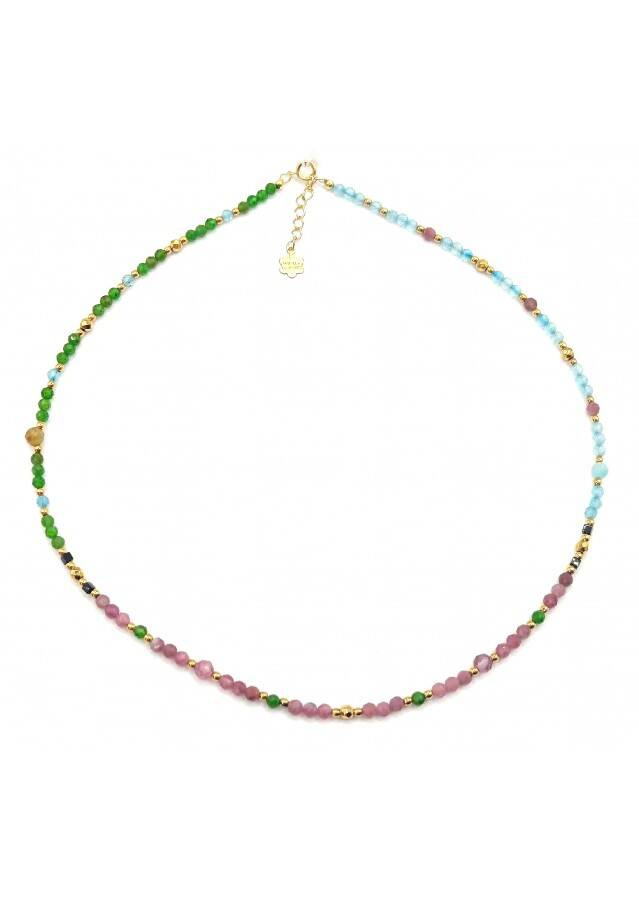 Naszyjnik wykonany ze srebra próby 925, pozłacanego 24 karatowym złotem. Kamień: Oliwin+ Apatyt+ Turmalin+ Hematyt Rozmiar kamienia: 4/3/2 mm Długość: 44 cm  Długości do wyboru: 38 cm /42 cm/ 44 cm Zapięcie: klasyczne (federing) Biżuteria ręcznie wykonana, produkt Polski.