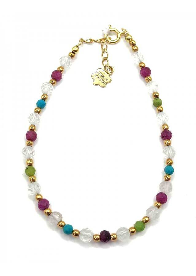 Bransoletka wykonana ze srebra próby 925, pozłacanego 24 karatowym złotem Kamień: Kryształ górski+ Turkus+ Rubin+ Granat+ Oliwin i Hematyt Rozmiar kamienia: 4/3/2mm Długość: 17,5 cm Zapięcie: federing Bransoletka może być wykonana na gumce- prosimy o informację w uwagach do zamówienia Biżuteria ręcznie wykonana, produkt Polski.