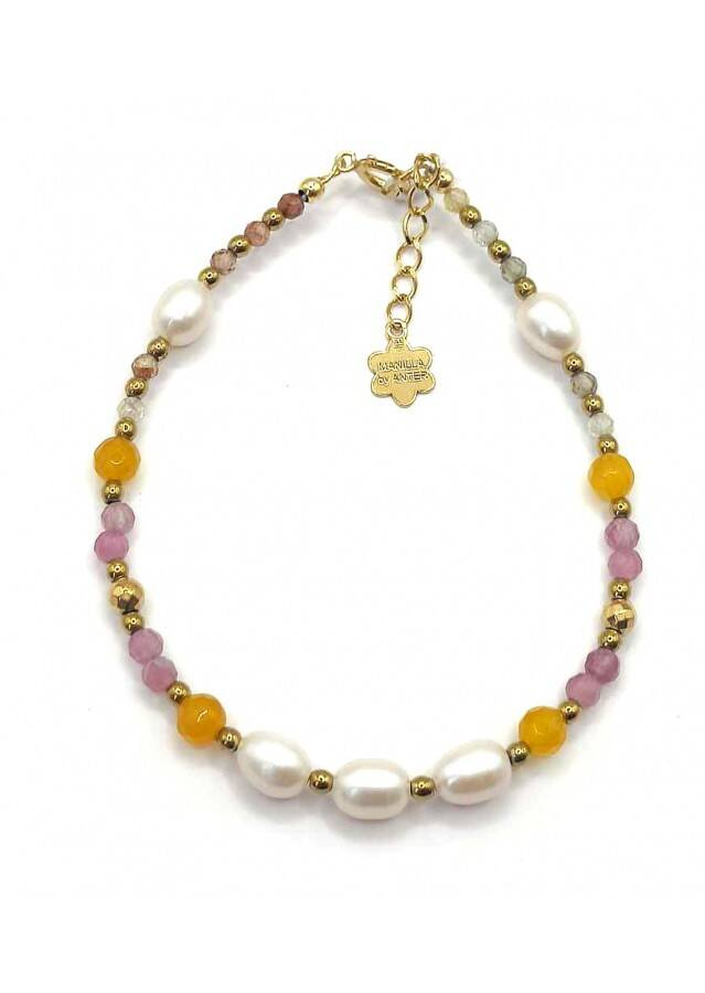 Bransoletka wykonana ze srebra próby 925, pozłacanego 24 karatowym złotem Kamień: Turmalin + Cytryn+ Perła i Hematyt Rozmiar kamienia: 34/2mm Długość: 17,5 cm Zapięcie: federing Bransoletka może być wykonana na gumce- prosimy o informację w uwagach do zamówienia Biżuteria ręcznie wykonana, produkt Polski.