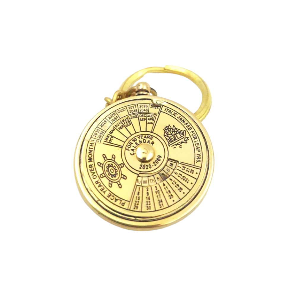 Breloczek kalendarz 50 - letni KR61 Śr. 3,6cm Kalendarz 50 - letni - lata: 2020-2069 Umożliwia odczytanie jaki będzie dzień tygodnia w dowolnym z dni w latach 2020-2069 Jest to możliwe dzięki ruchomer tarczy. Ustawiamy pożądany rok nad odpowiednim miesiącem i w okienku na dole odczytujemy dzień tygodnia, który pokazuje się nad numerem dnia.