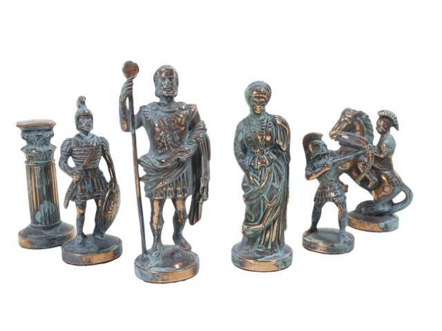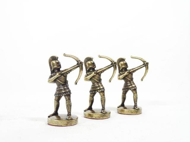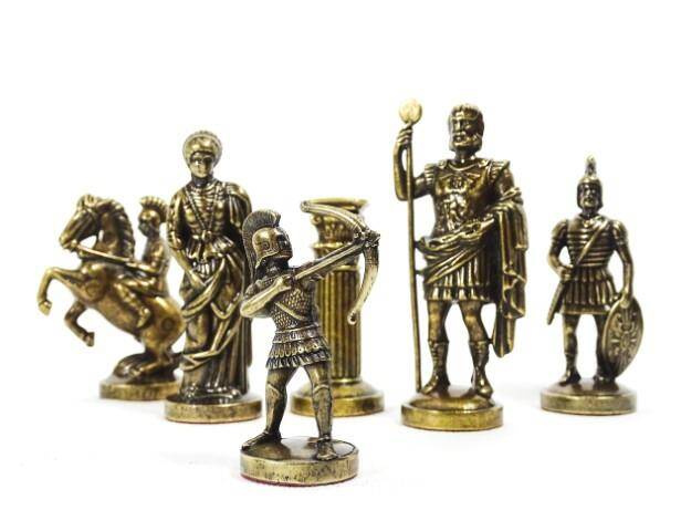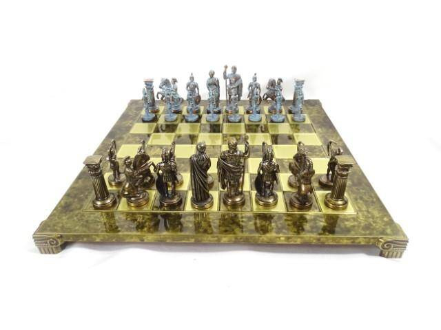 Duże ekskluzywne mosiężne szachy - Łucznicy 44x44cm, S10BBRO Szachy inspirowane elementami mitologii greckiej - piony to łucznicy, król i hetman - bogowie greccy, goniec- rycerz w rynsztunku, skoczek - jeździec, wieża - kolumna grecka. Bierki i szachownica - mosiężne Wymiary szachownicy: 44x44cm Wys. króla - 9,7cm Waga - 8kg Szachy zapakowane są w piękne, luksusowe, drewniane pudło. W środku starannie wykonana wypraska do układania i bezpiecznego przechowywania figur. Pudło zabezpiecza ozdobny czarno - złoty kartonik. Wykończenie ręczne najwyższej klasy. Produkt w najwyższym stopniu ekskluzywny, przepiękny prezent. Prezent dla szachisty, piękny element dekoracyjny. Wyprodukowane w Grecji przez renomowaną firmę Manopoulos z kilkudziesięcioletnią tradycją produkcji. Szachy Manopoulos rozpoznawane są na całym świecie jako małe dzieła sztuki.