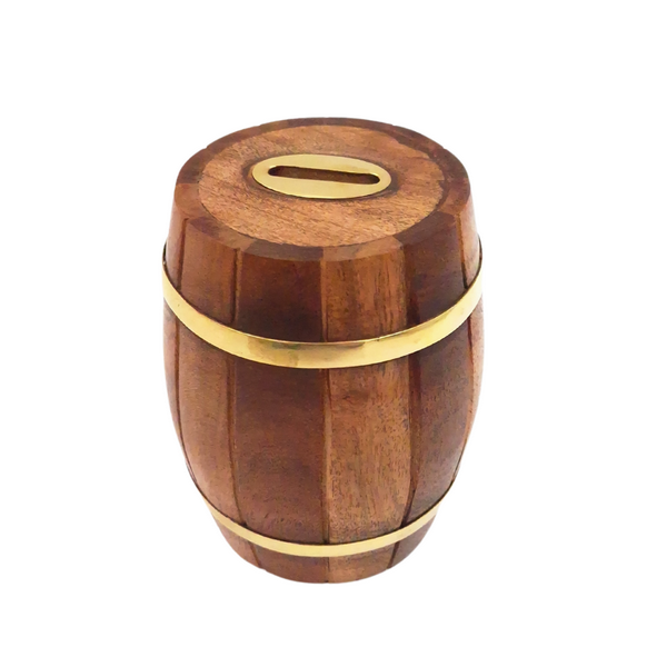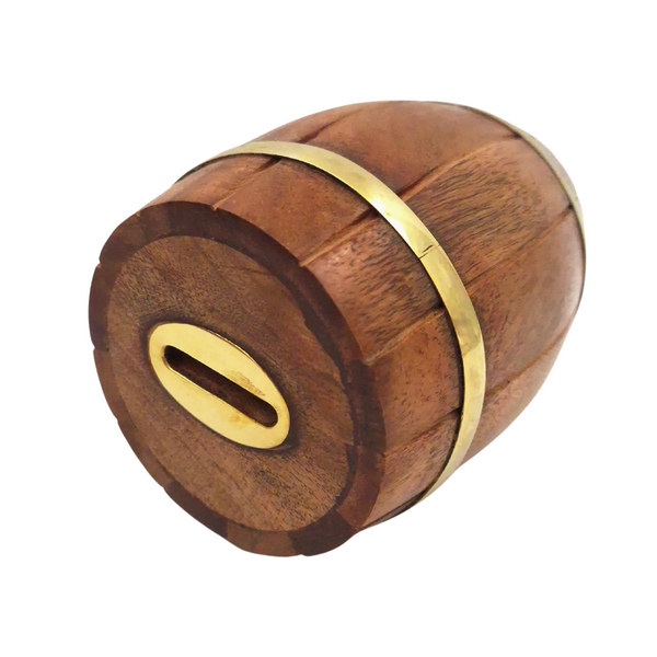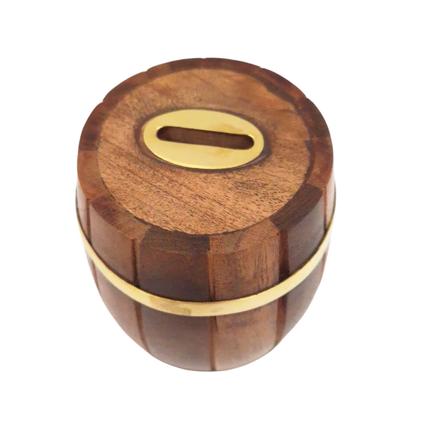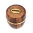 Skarbonka – Beczka - DNU-001 Drewniana skarbonka z okuciami mosiężnymi to połączenie funkcjonalności i estetyki. Dobry pomysł na prezent dla dziecka – pozwoli budować nawyk oszczędzanie pieniędzy. Skarbonka wielokrotnego użytku. Wysokość: 13 cm