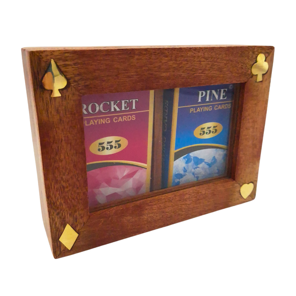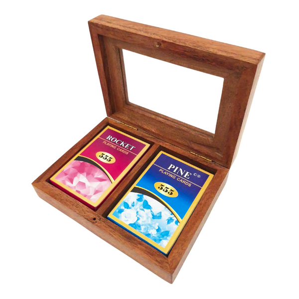 Dwie talie kart do gry w eleganckim drewnianym pudełku ze szklanym topem to doskonały pomysł na upominek dla miłośnika gier karcianych.