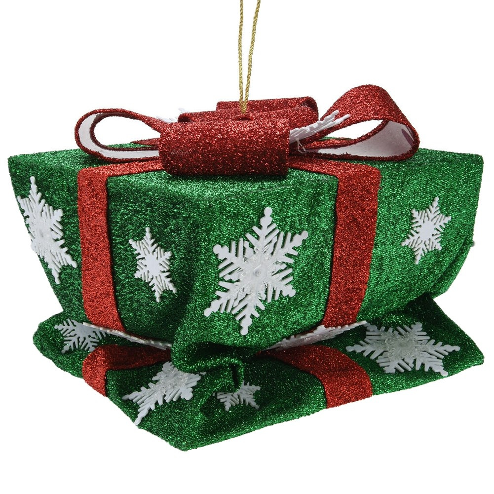 - EFEKTOWNY - Konstrukcja prezentu wykonana jest z metalu i pokryta ozdobnym tworzywem w kolorze zielonym. Prezent owinięty jest kokardą w czerwonym kolorze i posiada białe śnieżynki na powierzchni, dzięki czemu wygląda bardzo efektownie.