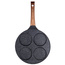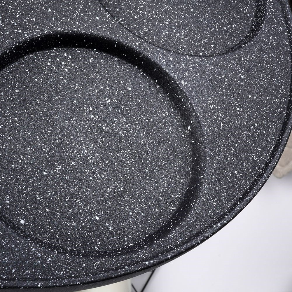 - PRZYDATNA - Patelnia idealna do przygotowywania jajek sadzonych i placuszków. Patelnia z linii Black&Wood o średnicy 26 cm z czterema dedykowanymi otworami o średnicy 9,5 cm, pozwala uzyskać perfekcyjny kształt potraw. Wymiary zewnętrzne: długość 46,5 cm, wysokość patelni 0,5 cm, wysokość z rączką 5,5 cm.