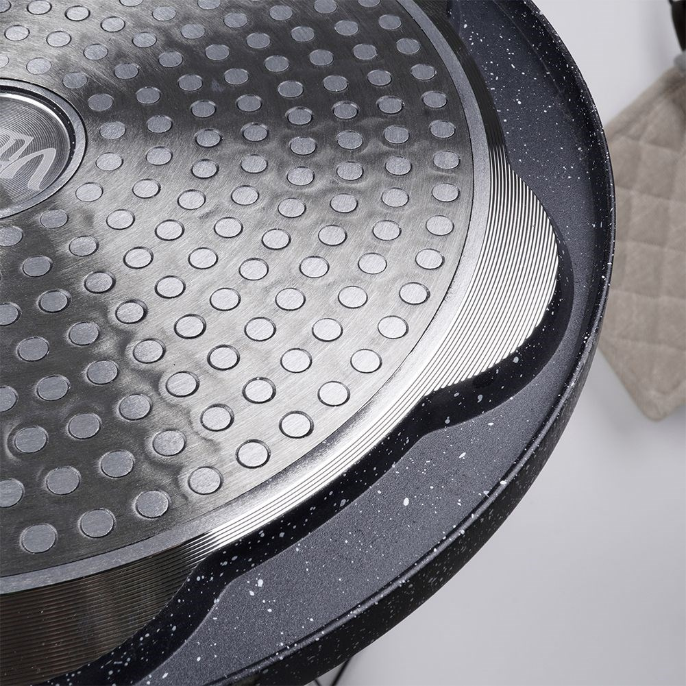 • ENERGOOSZCZĘDNA Doskonałe przewodnictwo materiału eliminuje straty ciepła, a tym samym pozwala to na oszczędność czasu potrzebnego do przygotowania potrawy. Patelnia jest skonstruowana w taki sposób, że ciepło rozchodzi się równomiernie po jej powierzchni.