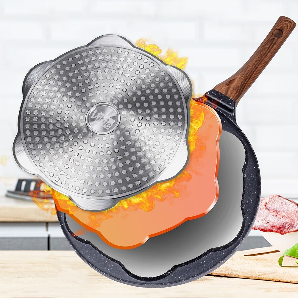 • NIEZAWODNA - Patelnia zapewnia szybkie i jednolite smażenie, co pozwala oszczędzać energię. Świetnie sprawdzi się do smażenia oraz duszenia. Pozwala uzyskać perfekcyjny kształt potraw. Przygotujemy na niej jajka sadzone, placuszki, a także ulubione naleśniki typu pancakes, nadając im kształt okrągłych buziek z uśmiechami i oczami.