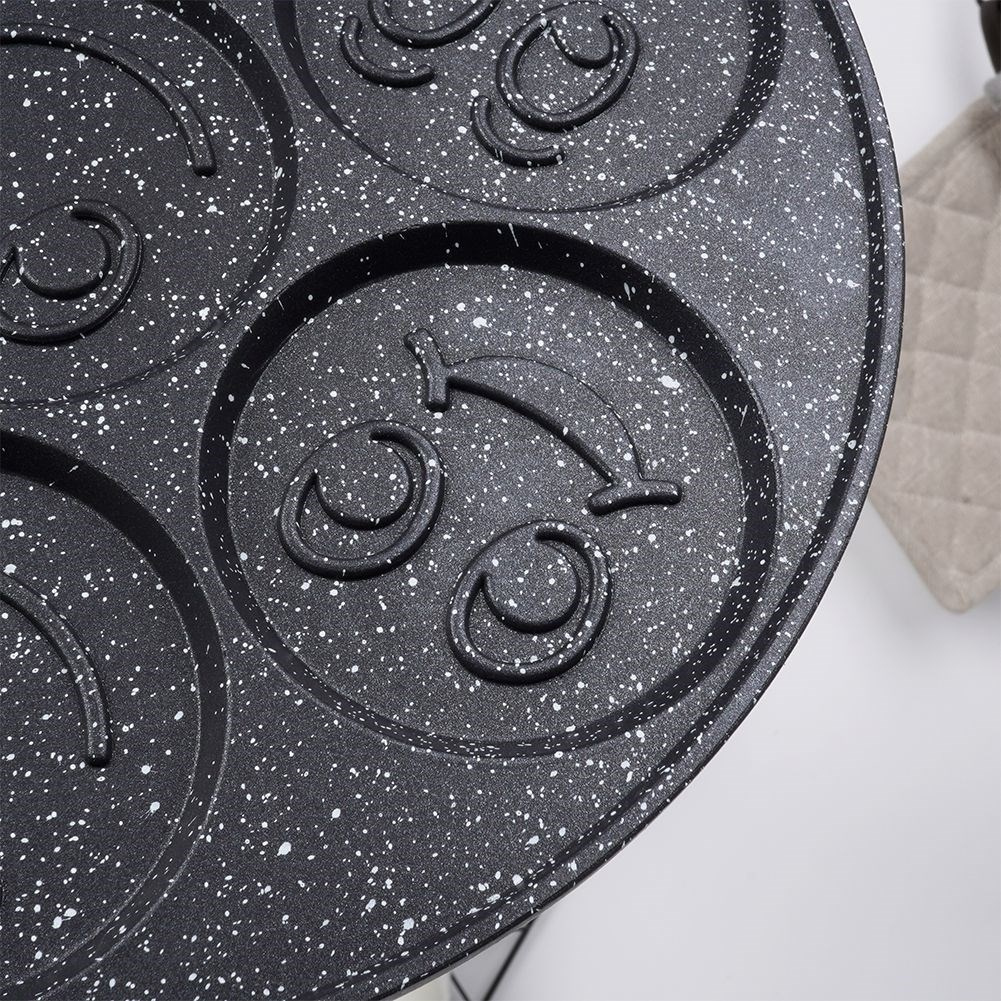 • Patelnia granitowa o średnicy 26 cm z 7 otworami z różnymi buźkami. Idealna do przygotowania naleśników, placuszków oraz jajek. Nadaje się do wszystkich rodzajów kuchenek oraz do mycia w zmywarce.