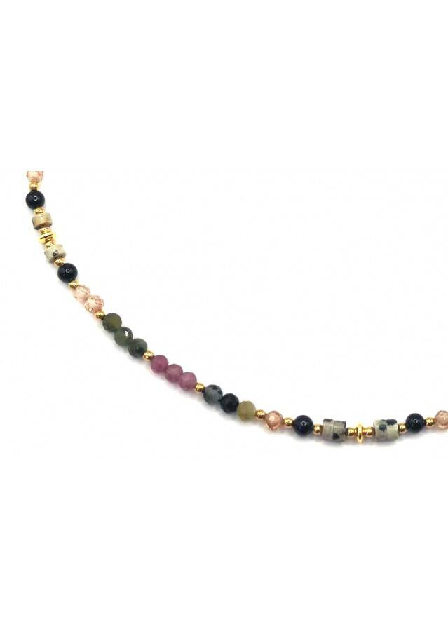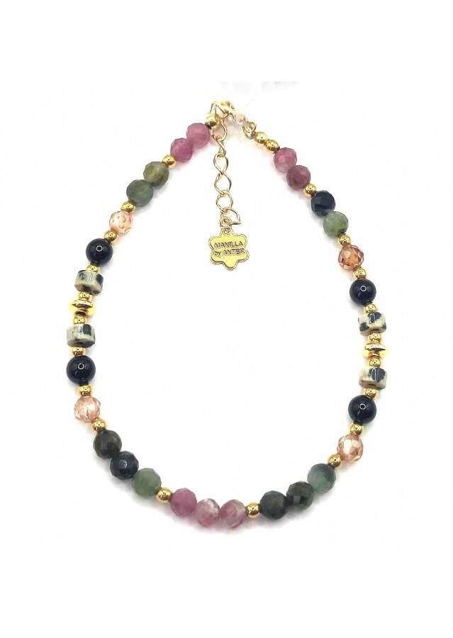 Bransoletka wykonana ze srebra próby 925, pozłacanego 24 karatowym złotem Kamień: Turmalin + Jaspis i Hematyt Rozmiar kamienia: 3/2mm Długość: 17,5 cm