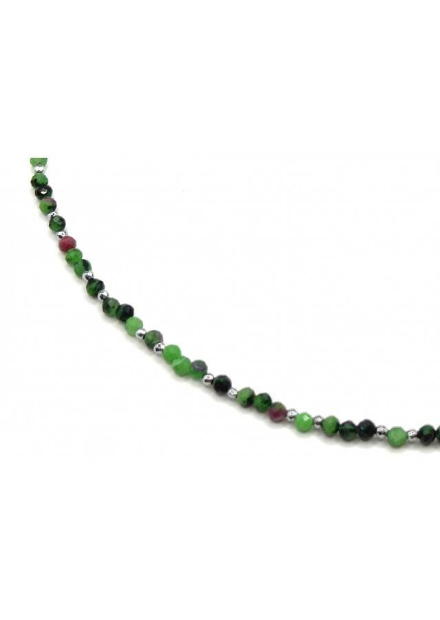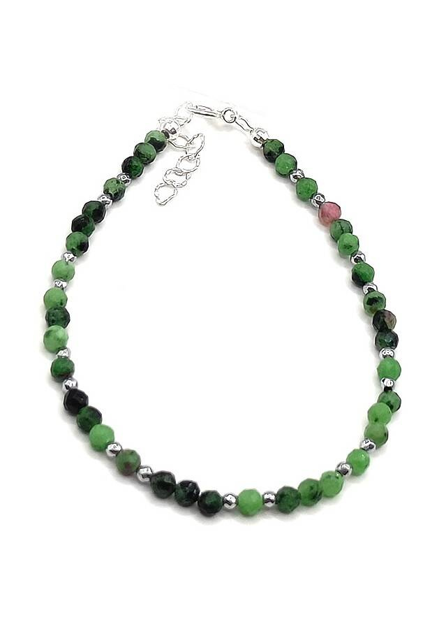 Bransoletka wykonana ze srebra próby 925, rodowanego Kamień: Zoizyt z rubinem i Hematyt Rozmiar kamienia: 2mm Długość: 17,5 cm Zapięcie: federing Bransoletka może być wykonana na gumce- prosimy o informację w uwagach do zamówienia Biżuteria ręcznie wykonana, produkt Polski.