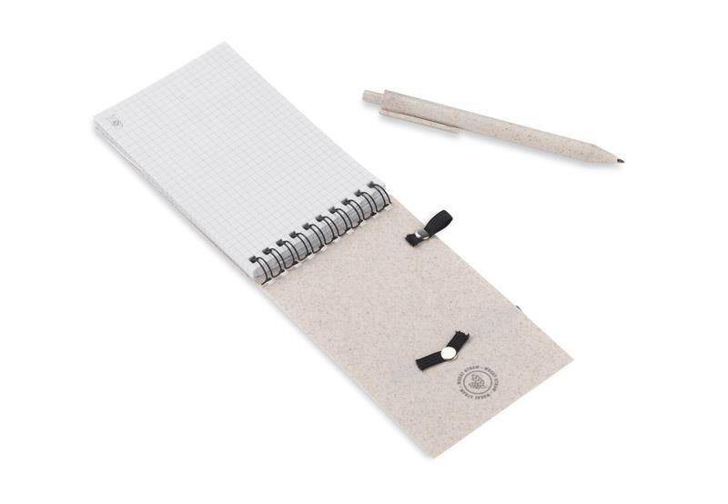 Notes TRESA z długopisem, kolorystyką dopasowanym do okładki. Długopis oraz okładka notesu wykonane są ze słomy pszenicznej. Notes na spirali, posiada 70 kartek w kratkę wykonanych z recyklingowanego papieru. Zamykany za pomocą gumki. Format A6. Wkład w długopisie w kolorze niebieskim.