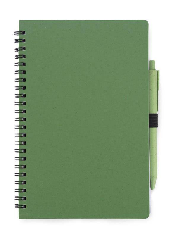 Notes TRESA z długopisem, kolorystyką dopasowanym do okładki. Długopis oraz okładka notesu wykonane są ze słomy pszenicznej. Notes na spirali, posiada 70 kartek w kratkę wykonanych z recyklingowanego papieru. Format A5. Wkład w długopisie w kolorze niebieskim.