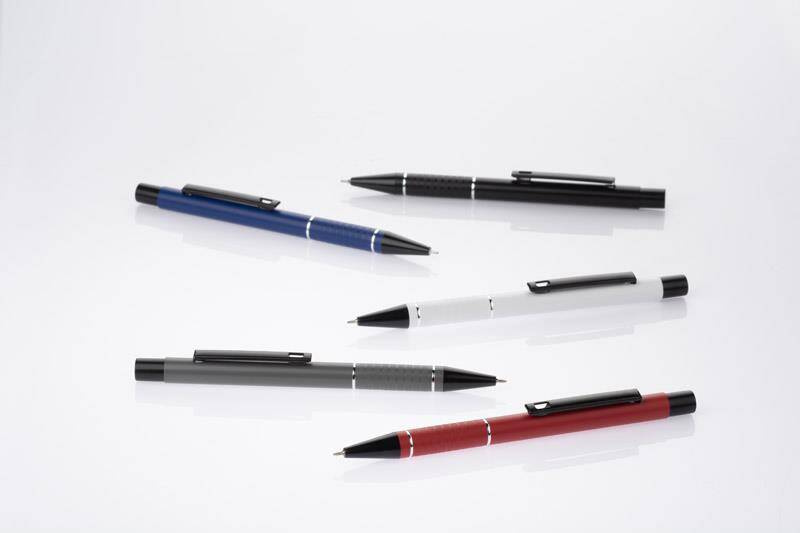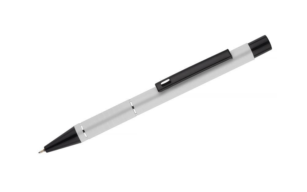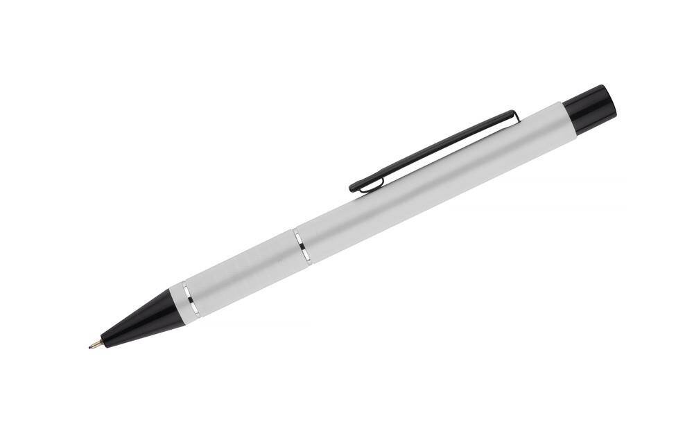 Korpus długopisu został ozdobiony dwoma srebrnymi ringami oraz paskami o delikatnie chropowatej strukturze, dodając mu przyjemnie sensorycznego wymiaru.