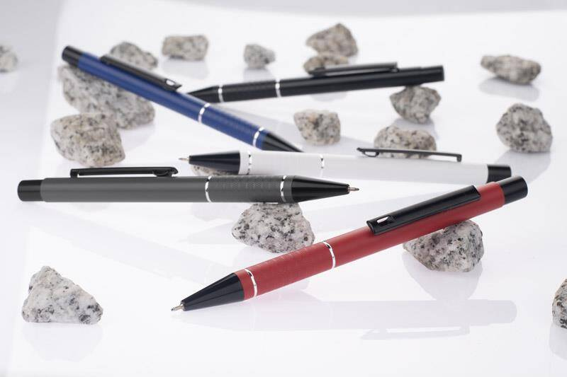 Korpus długopisu został ozdobiony dwoma srebrnymi ringami oraz paskami o delikatnie chropowatej strukturze, dodając mu przyjemnie sensorycznego wymiaru.