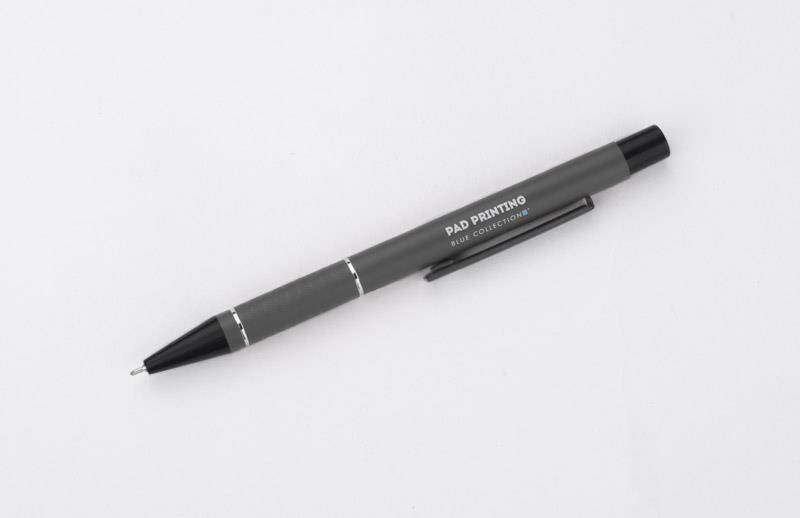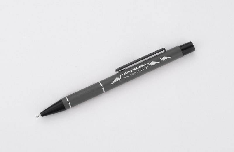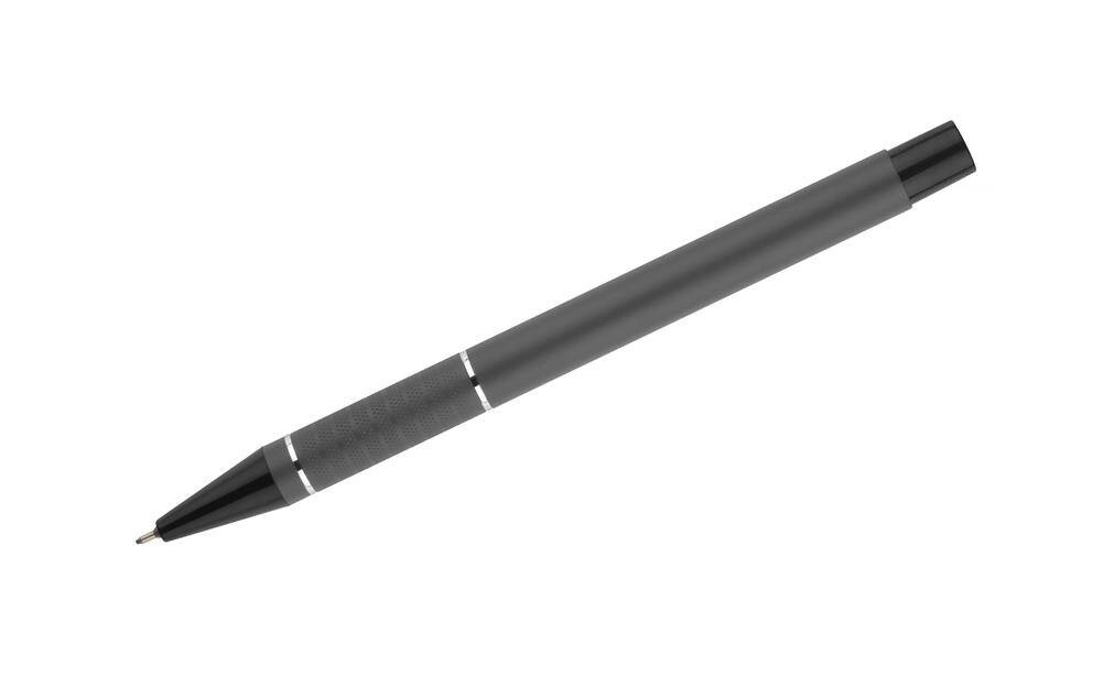 Korpus długopisu został ozdobiony dwoma srebrnymi ringami oraz paskami o delikatnie chropowatej strukturze, dodając mu przyjemnie sensorycznego wymiaru.