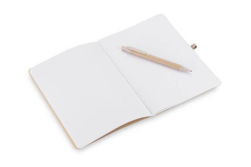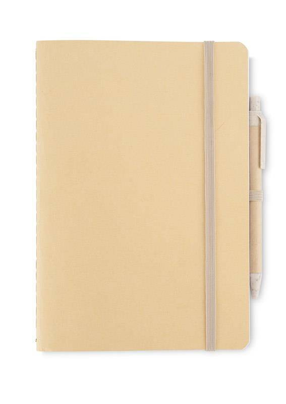 Notes REMATT w ekologicznej okładce wykonanej z recyklingowanego papieru w klasycznym brązowym kolorze. Do notesu dołączony jest długopis z niebieskim wkładem, którego korpus wykonany jest z recyklingowanego papieru, z wykończeniami z tworzywa ze słomy pszennej. Notes zamykany za pomocą gumki. Format A5.