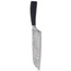 • Nóż kuchenny typu Santoku z ostrzem o długości 18 cm. Ostrze wykonane ze stali damasceńskiej a uchwyt z drewna pakka. Posiada żłobienia na ostrzu noża.