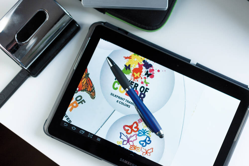 Długopis SWAY TOUCH z profilowanym korpusem, mechanizmem rotacyjnym, uchwytem pokrytym gumą i końcówką do ekranu dotykowego, z możliwością wymiany wkładu, tusz niebieski.