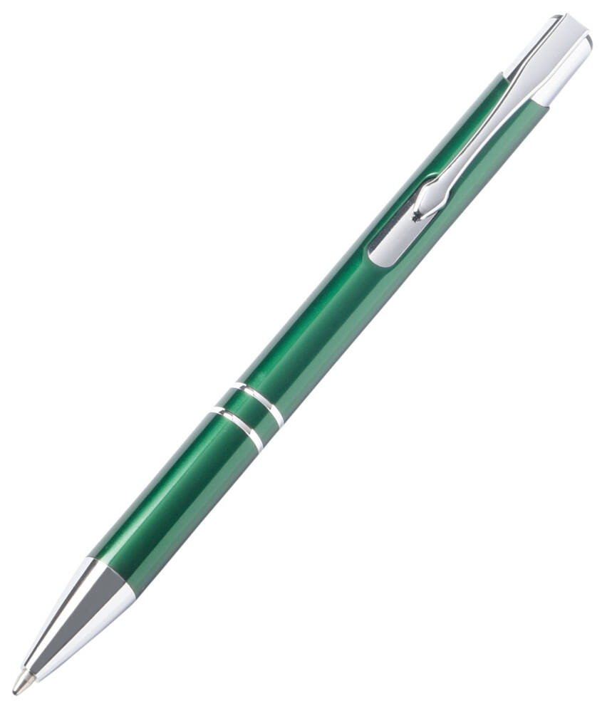 Aluminiowy długopis TUCSON z błyszczącym, metalowym korpusem, mechanizmem dociskowym i dużym, niebieskim wkładem.
