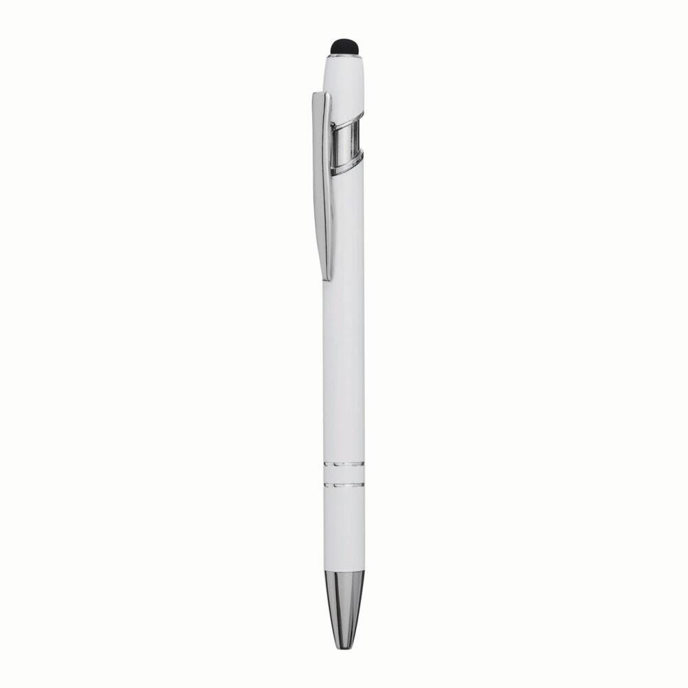 Aluminiowy długopis MERCHANT: z błyszczącą metalową obudową, mechanizmem na przycisk, gumowaną końcówką do ekranów dotykowych, niebieskim wkładem