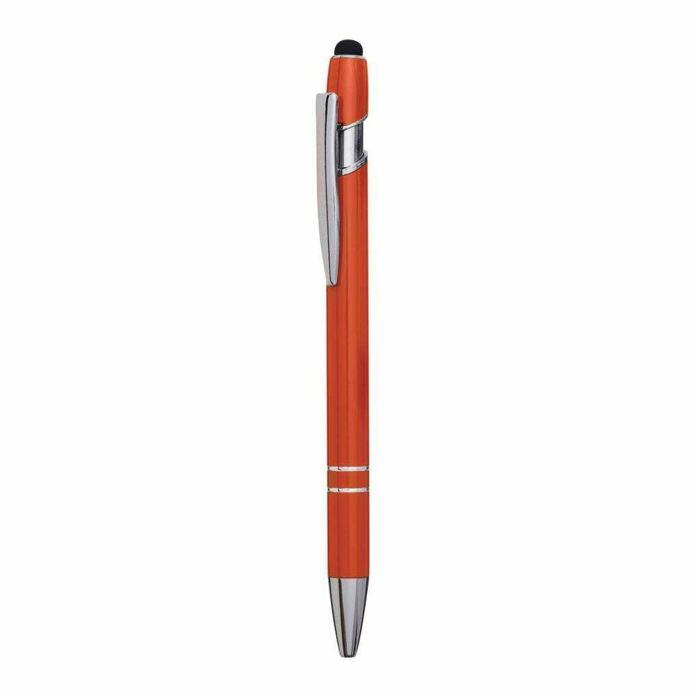 Aluminiowy długopis MERCHANT: z błyszczącą metalową obudową, mechanizmem na przycisk, gumowaną końcówką do ekranów dotykowych, niebieskim wkładem