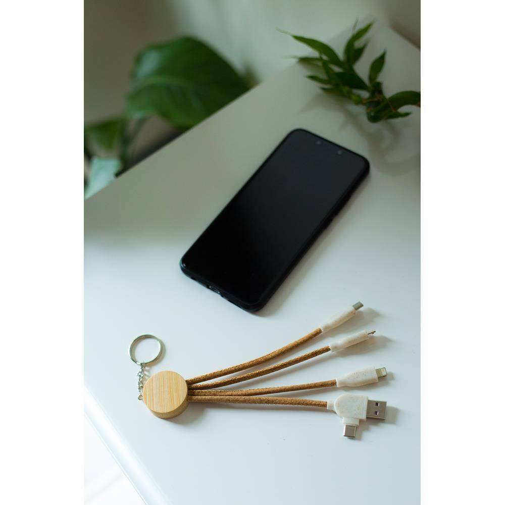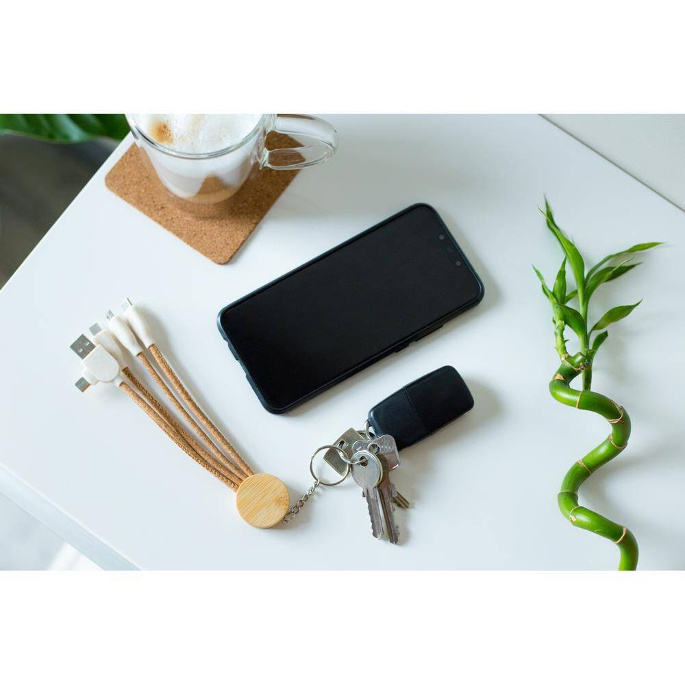 Brelok do kluczy, korkowy kabel do ładowania B'RIGHT, elementy z bambusa i włókien słomy pszenicznej, 17 cm, 5 końcówek: USB, 2x USB typu C, micro USB oraz