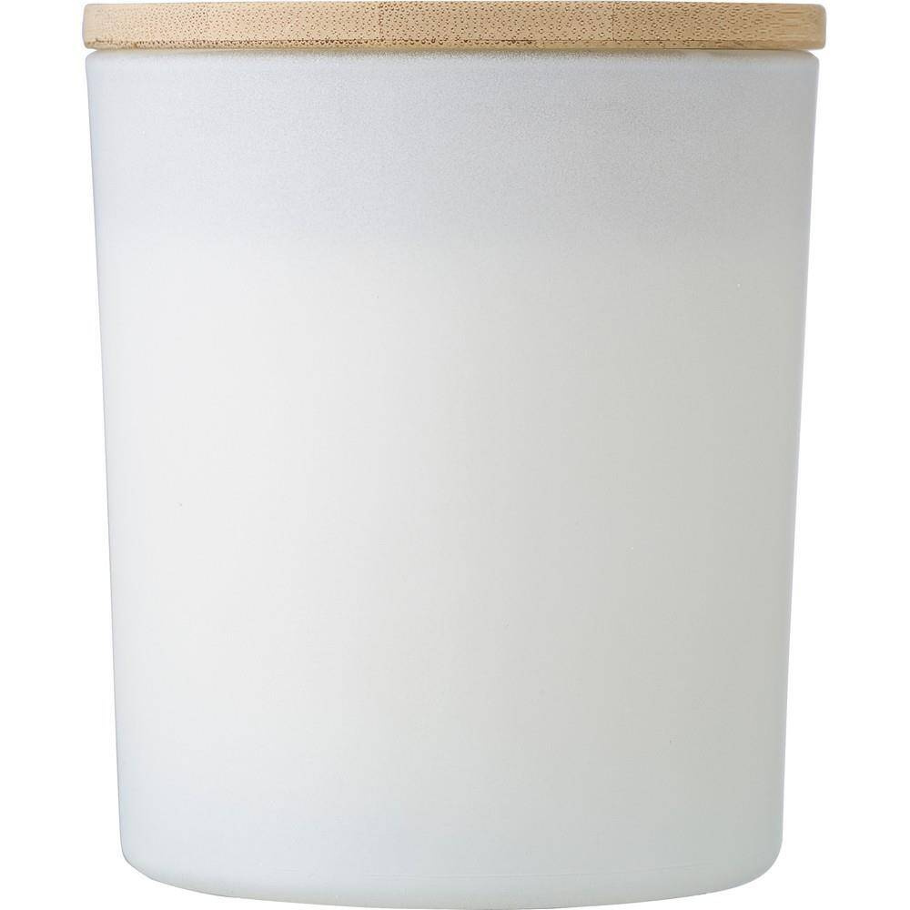 Świeczka zapachowa w szklanym słoiczku z bambusowym wieczkiem, zawiera głównie wosk roślinny (wosk carbauba), czas palenia około 46 godzin