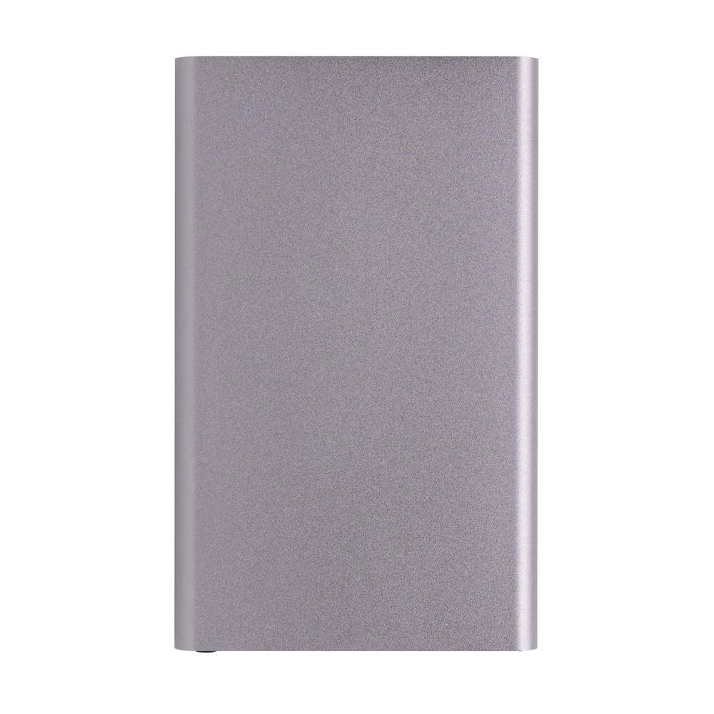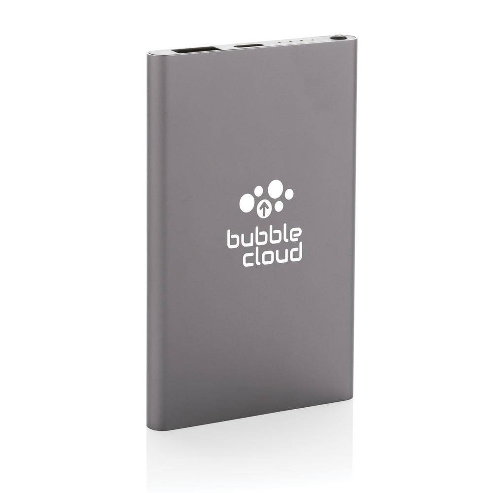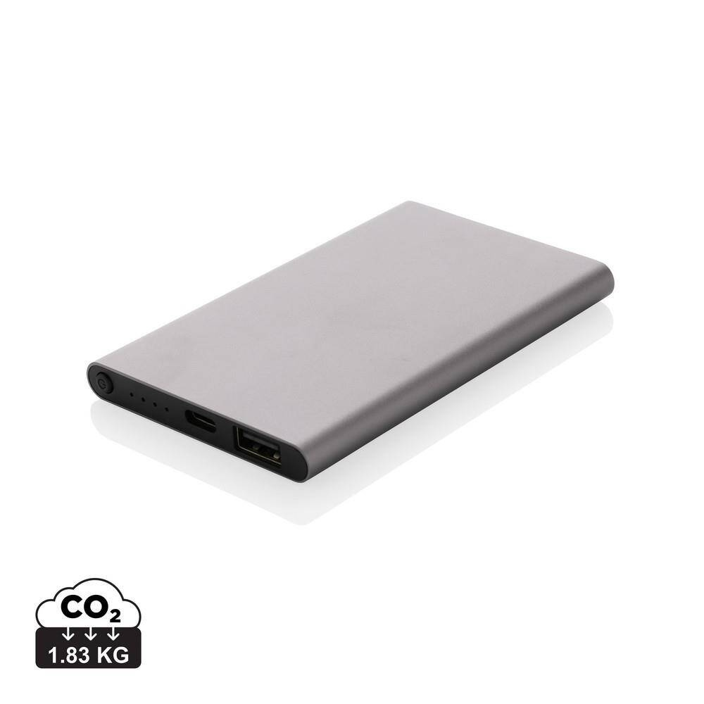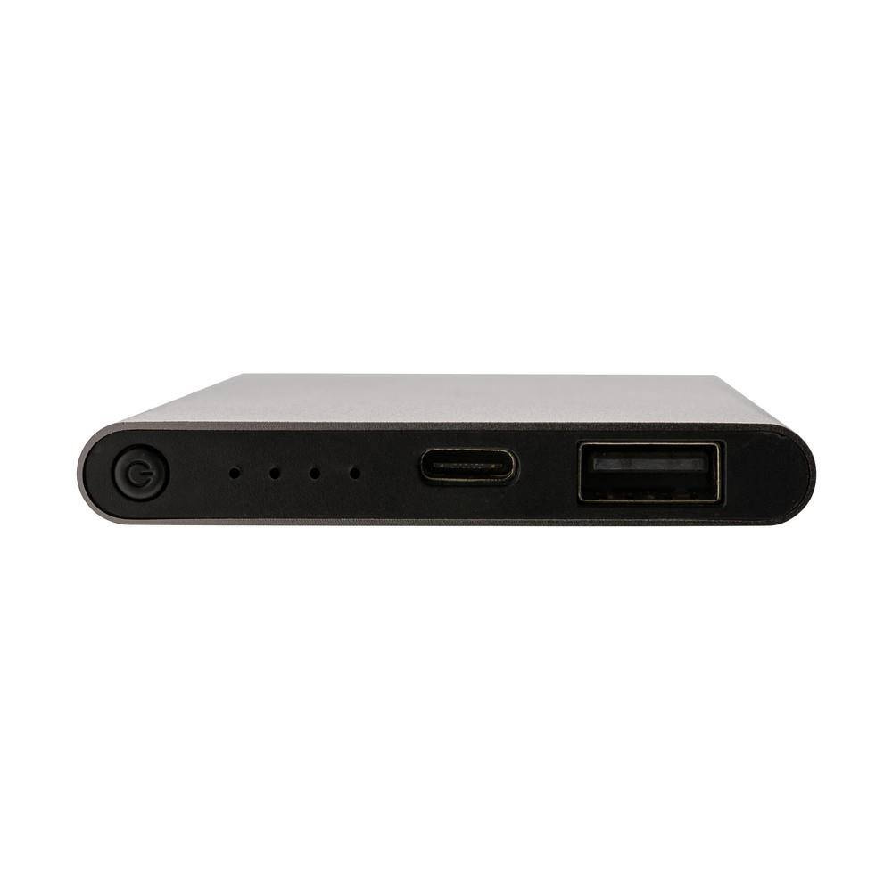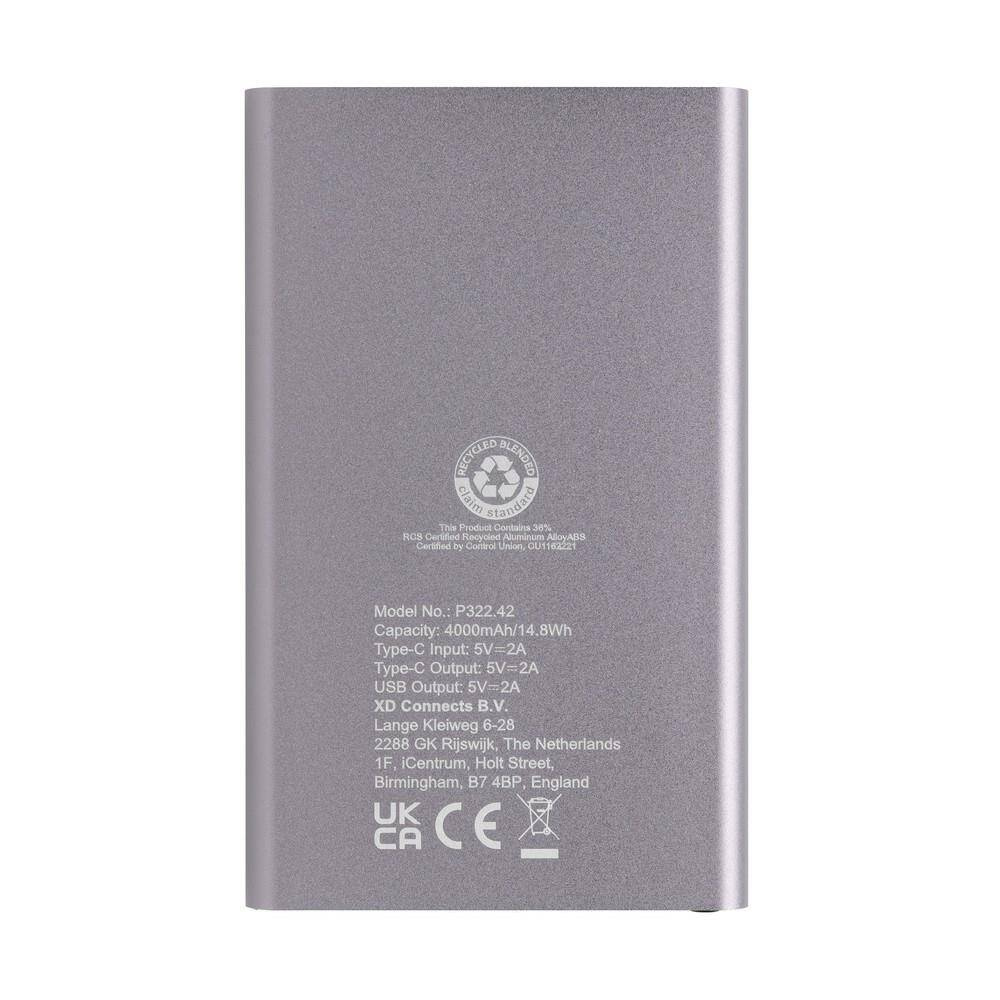 Power bank 4000 mAh, wskaźniki poziomu naładowania, wbudowany akumulator litowo-polimerowy klasy A, wykonany z aluminium i ABS z recyklingu, całkowita zawartość materiałów obliczona na podstawie wagi całkowitej przedmiotu: 66%, wejście USB typu C 5V/2A, wyjście USB typu C 5V/2A, wyjście USB 5V/2A, kabel z TPE z recyklingu z certyfikatem RCS w komplecie, w pudełku z papieru z certyfikatem FSC® mix