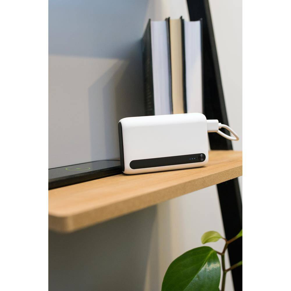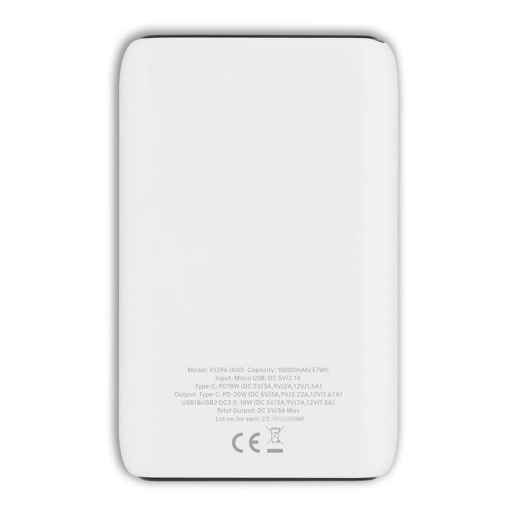 Power bank 10000 mAh, 4 diody wskazujące poziom naładowania, gumowana obudowa, wejście micro USB oraz USB typu C (18W), 2 wyjścia USB (18W), wyjście USB typu C (20W), możliwość ładowania trzech urządzeń jednocześnie, kabel USB typu C w komplecie