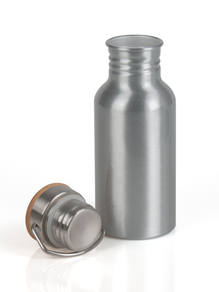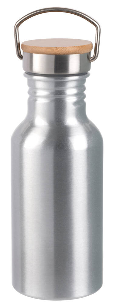 Aluminiowa butelka ECO TRANSIT z bambusową zakrętką i uchwytem do przenoszenia.