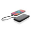 Power bank 10000 mAh, wskaźniki poziomu naładowania, wbudowany akumulator litowo-polimerowy klasy A, wykonany z aluminium i ABS z recyklingu, całkowita zawartość materiałów obliczona na podstawie wagi całkowitej przedmiotu: 21%, wejście USB typu C 5V/2.4A, wyjście USB typu C 5V/2.4A, wyjście iOS 5V/1A, kabel z TPE z recyklingu z certyfikatem RCS w komplecie