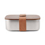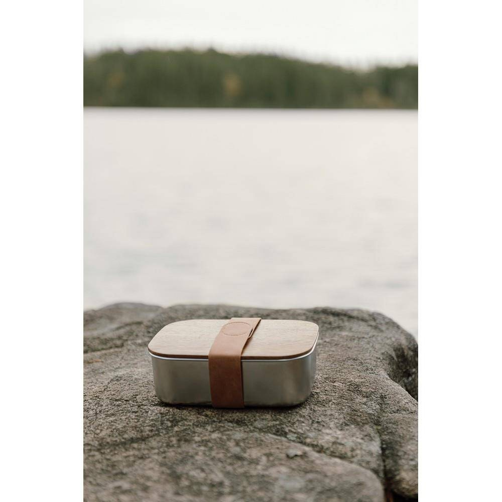 Pudełko śniadaniowe, lunchbox, drewniana pokrywka, pasek na rzep, wykonane ze stali nierdzewnej z recyklingu, całkowita zawartość materiałów z recyklingu obliczona na