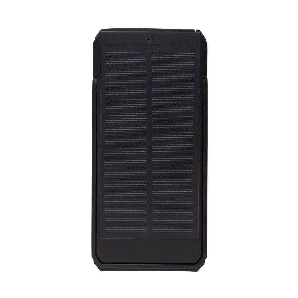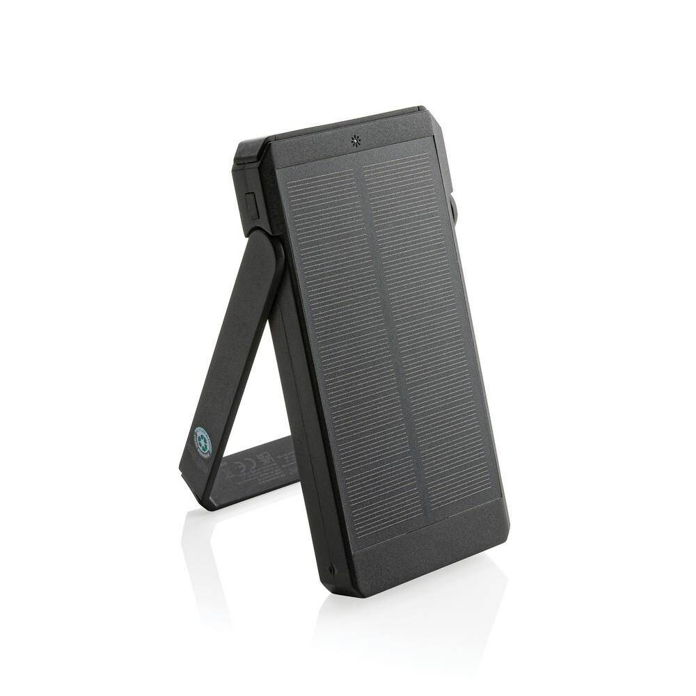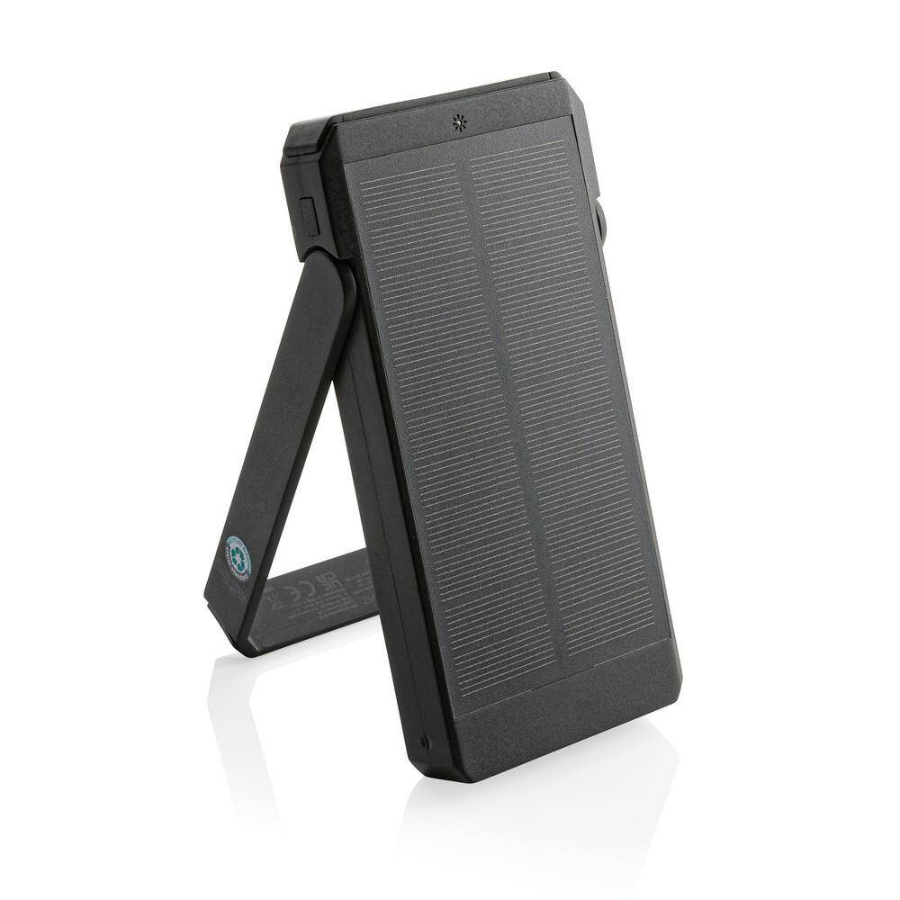 Power bank 10000 mAh z panelem słonecznym, stojak, wykonany z ABS z recyklingu z certyfikatem RCS, całkowita zawartość materiałów z recyklingu obliczona w oparciu o wagę całkowitą przedmiotu: 19%, szybkość ładowania energią słoneczną 5V/0.2A, wejście 5V/2A, wyjście 5V/2A, kabel z TPE z recyklingu z certyfikatem RCS w komplecie, w pudełku z papieru kraftowego z certyfikatem FSC®, wzór zastrzeżony®