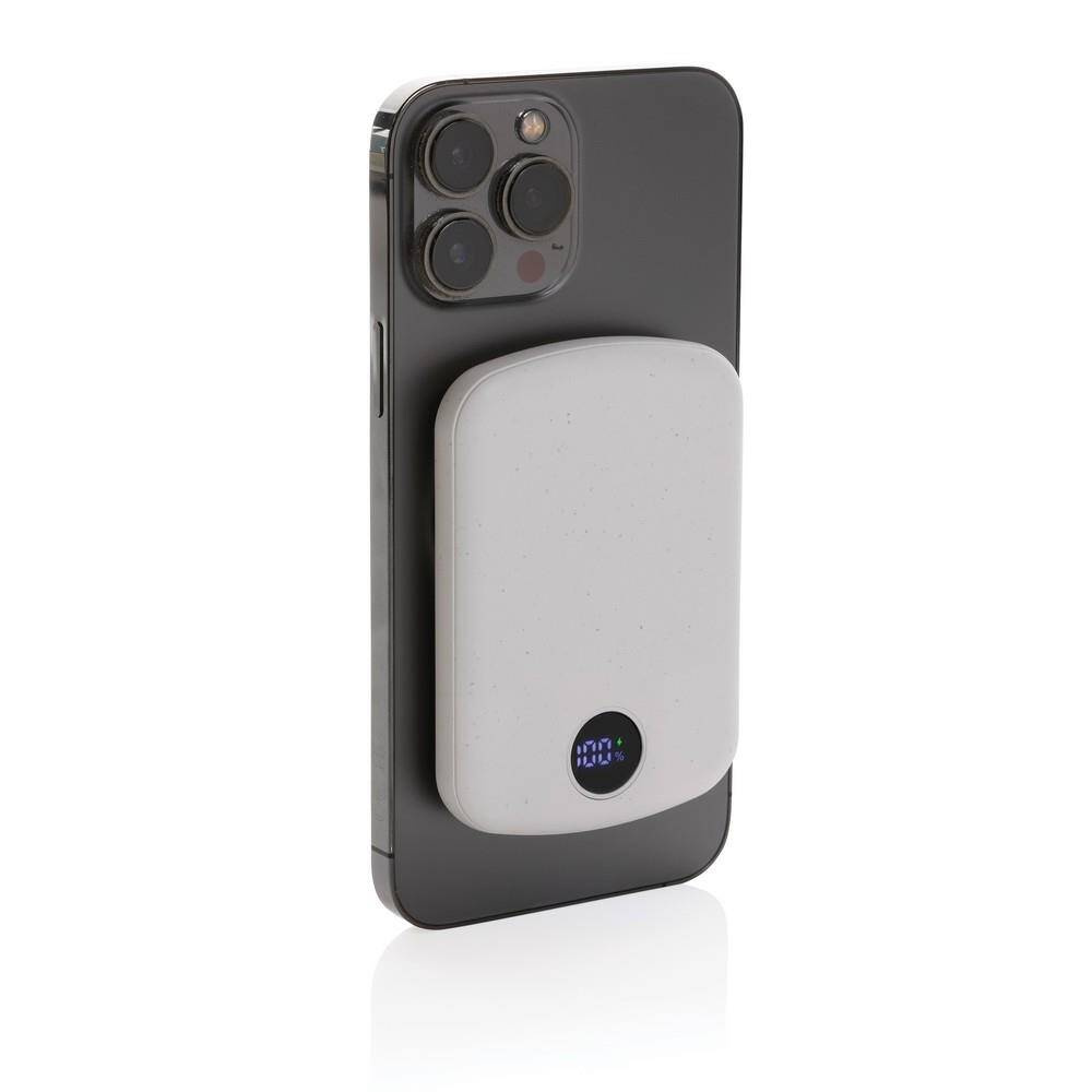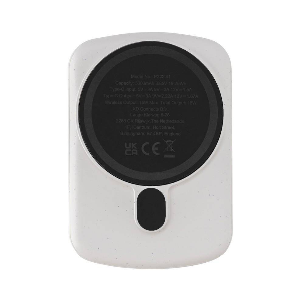 Power bank 5000 mAh, magnetyczna ładowarka bezprzewodowa 15W, cyfrowy wyświetlacz poziomu naładowania, wykonany z ABS z recyklingu, całkowita zawartość materiałów z recyklingu obliczona na podstawie wagi całkowitej przedmiotu: 21%, wejście USB typu C 5-12V/1.5-3A, wyjście USB typu C 5-12V/1.67-2.4A, kabel w komplecie, w pudełku z certyfikatem FSC® mix