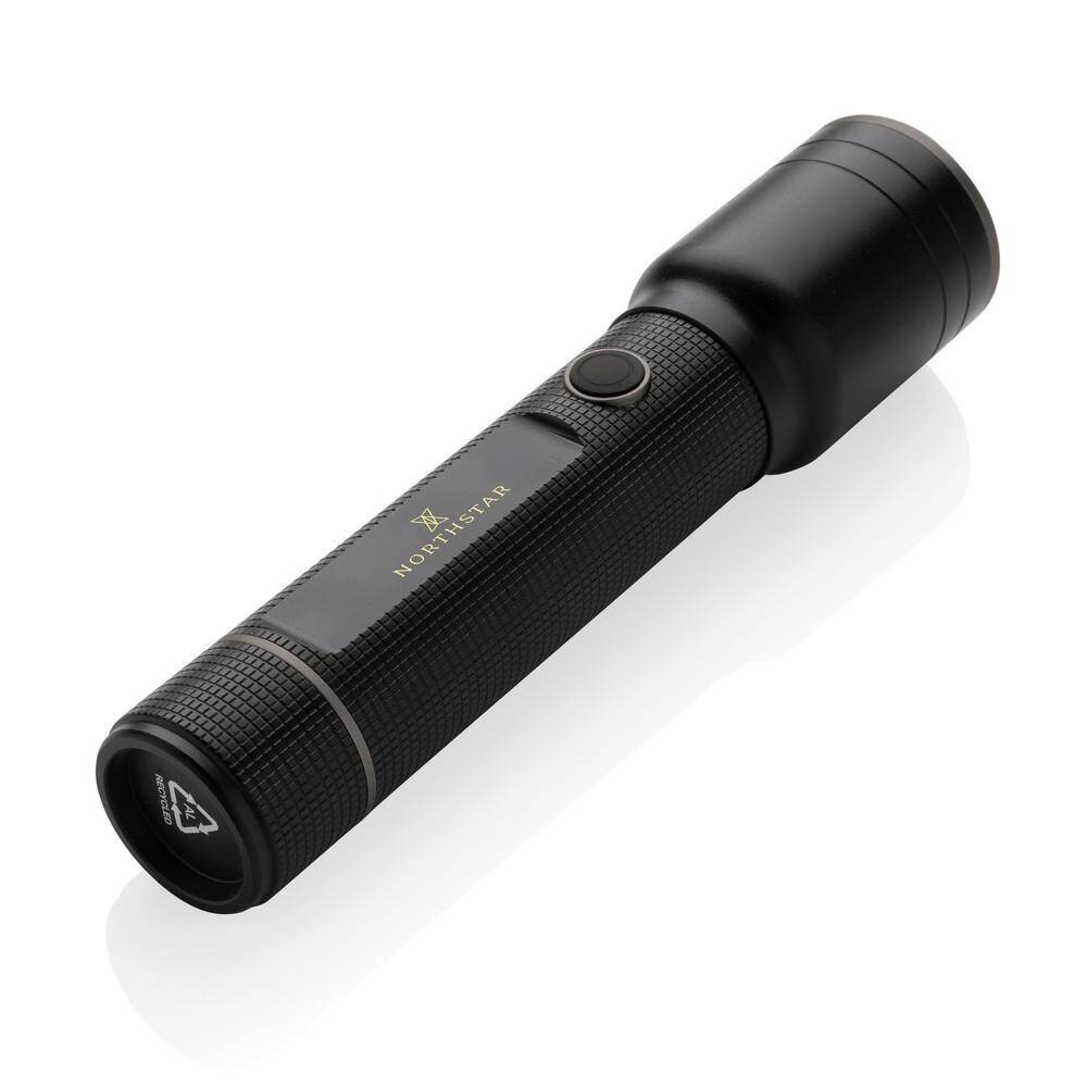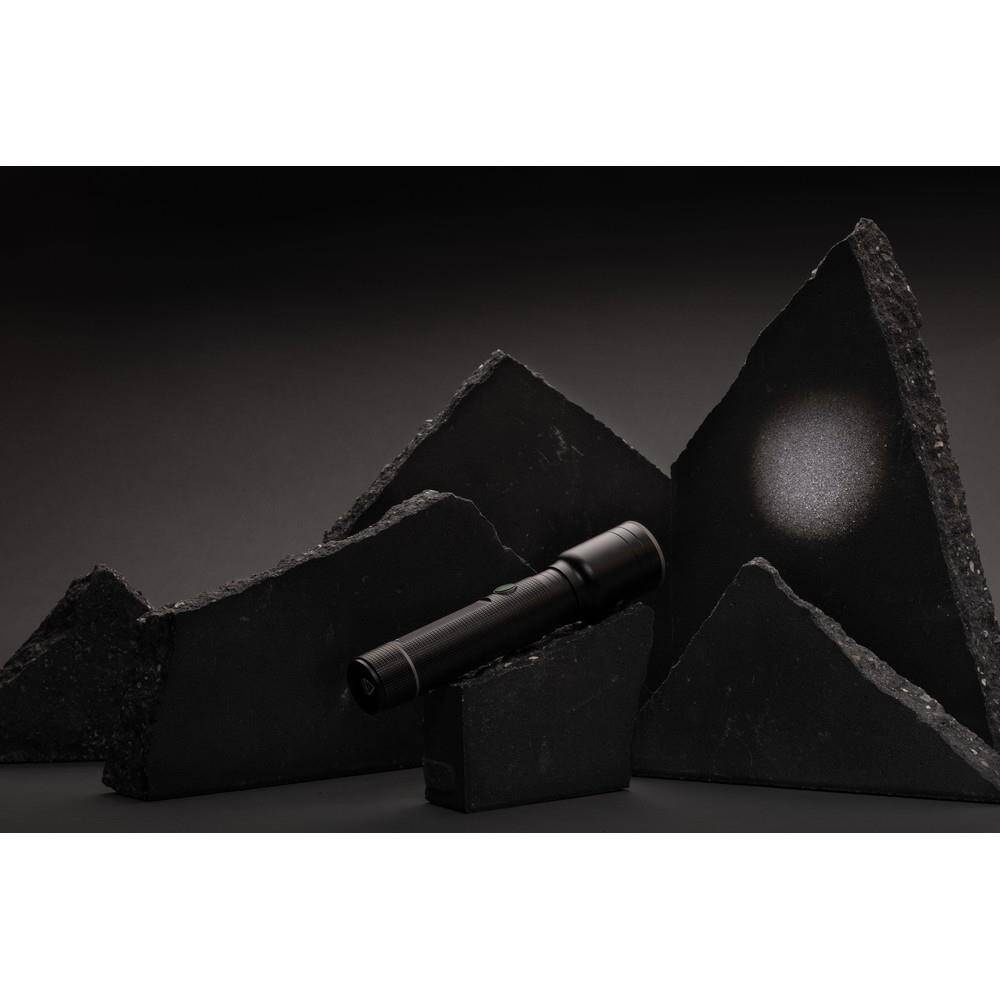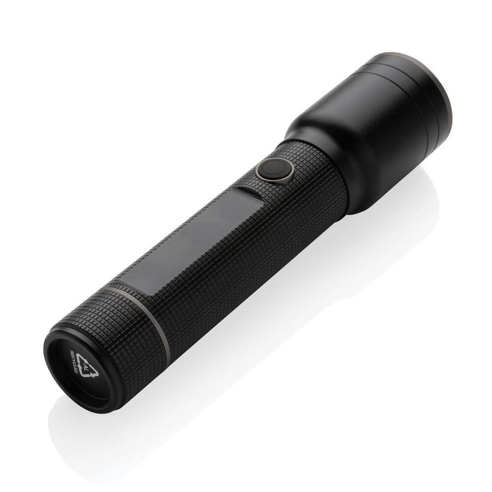 Latarka 10W o bardzo jasnym świetle, wodoodporna IP4, wiązka 1500 lumenów sięgająca do 800 m, wysokiej jakości żarówka z 5 trybami świecenia, w tym SOS, wbudowany akumulator 4000 mAh pozwala na około 10 godzin ciągłego świecenia, ładowana za pomocą USB, wykonana z aluminium z recyklingu z certyfikatem RCS, całkowita zawartość materiałów z recyklingu obliczona w oparciu o wagę całkowitą przedmiotu: 20%, w pudełku z papieru kraftowego z certyfikatem FSC mix