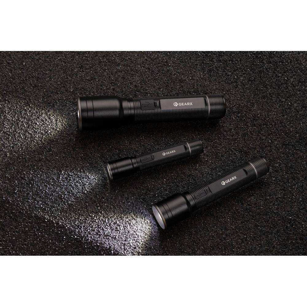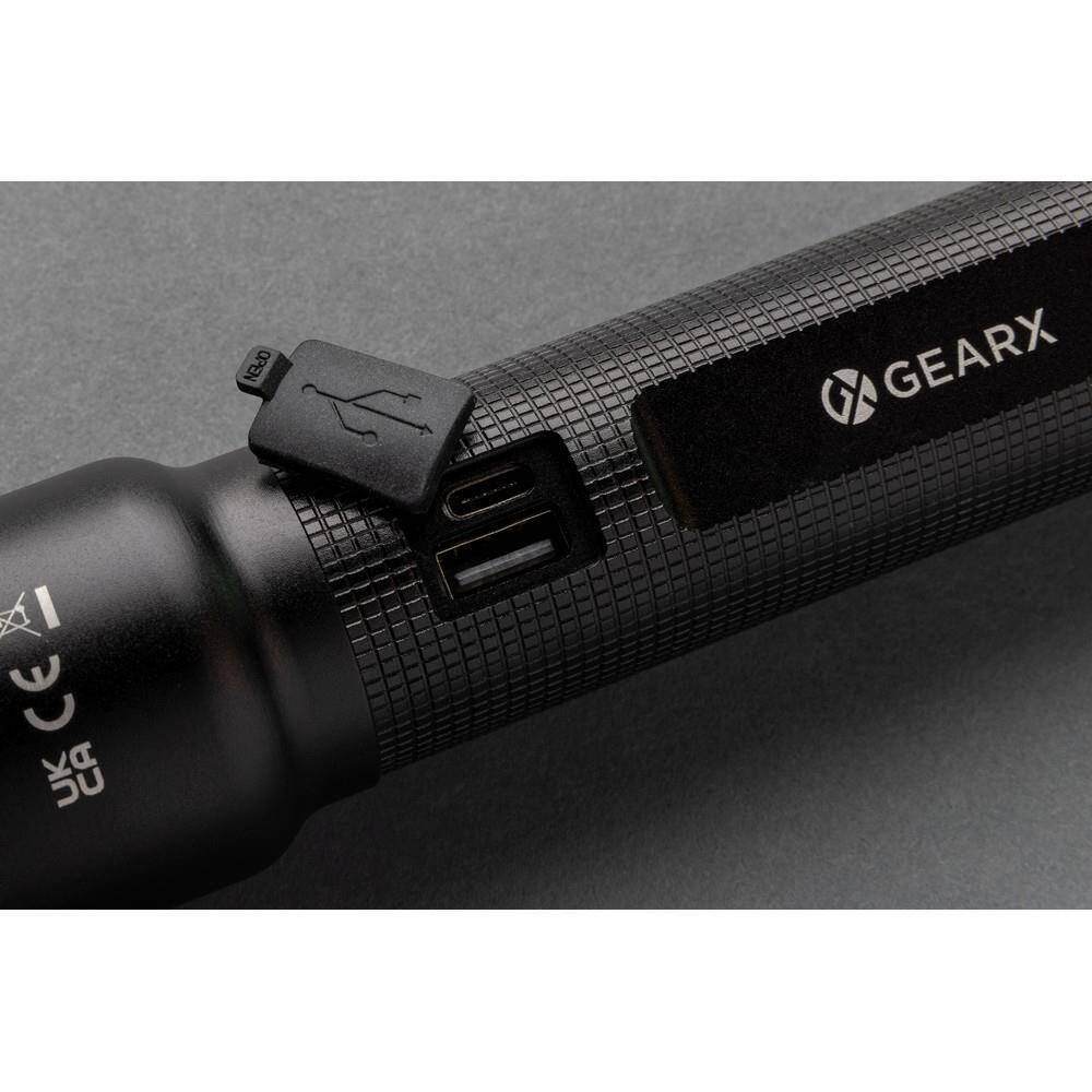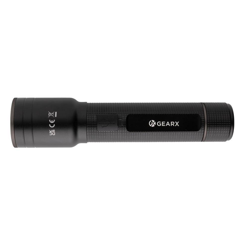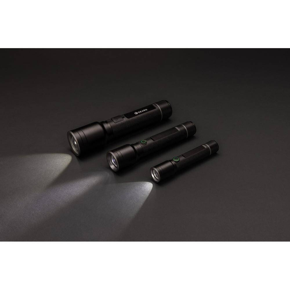 Latarka 10W o bardzo jasnym świetle, wodoodporna IP4, wiązka 1500 lumenów sięgająca do 800 m, wysokiej jakości żarówka z 5 trybami świecenia, w tym SOS, wbudowany akumulator 4000 mAh pozwala na około 10 godzin ciągłego świecenia, ładowana za pomocą USB, wykonana z aluminium z recyklingu z certyfikatem RCS, całkowita zawartość materiałów z recyklingu obliczona w oparciu o wagę całkowitą przedmiotu: 20%, w pudełku z papieru kraftowego z certyfikatem FSC mix