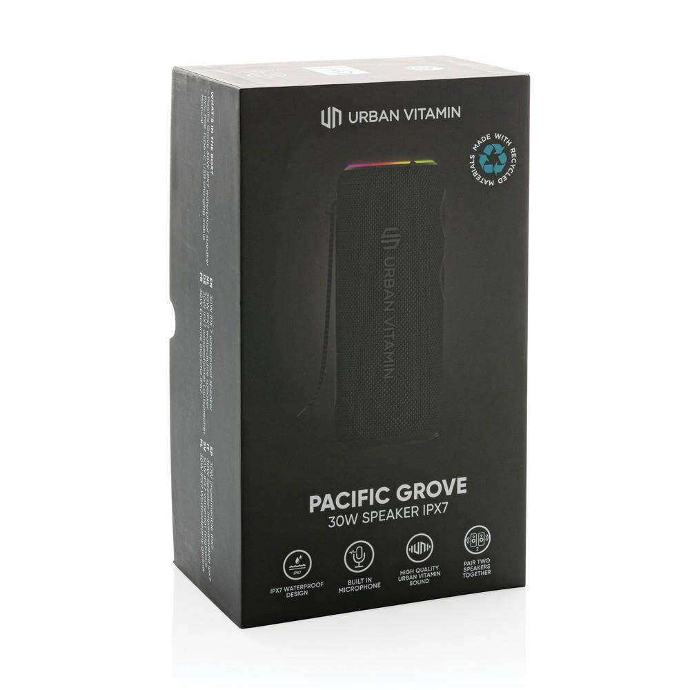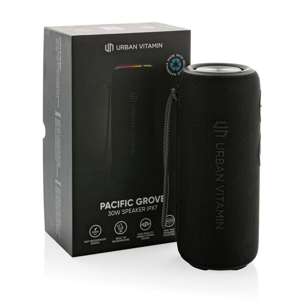 Głośnik bezprzewodowy 30 W, wodoodporny IPX7, uchwyt, 2 głośniki niskotonowe, możliwość sparowania dwóch głośników w celu uzyskania dźwięku stereo, do 8 godzin odtwarzania na jednym ładowaniu, wykonany z ABS i PET z recyklingu z certyfikatem RCS, całkowita zawartość materiałów obliczona na podstawie wagi całkowitej przedmiotu: 36%