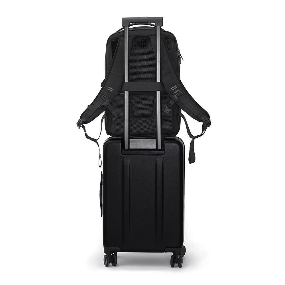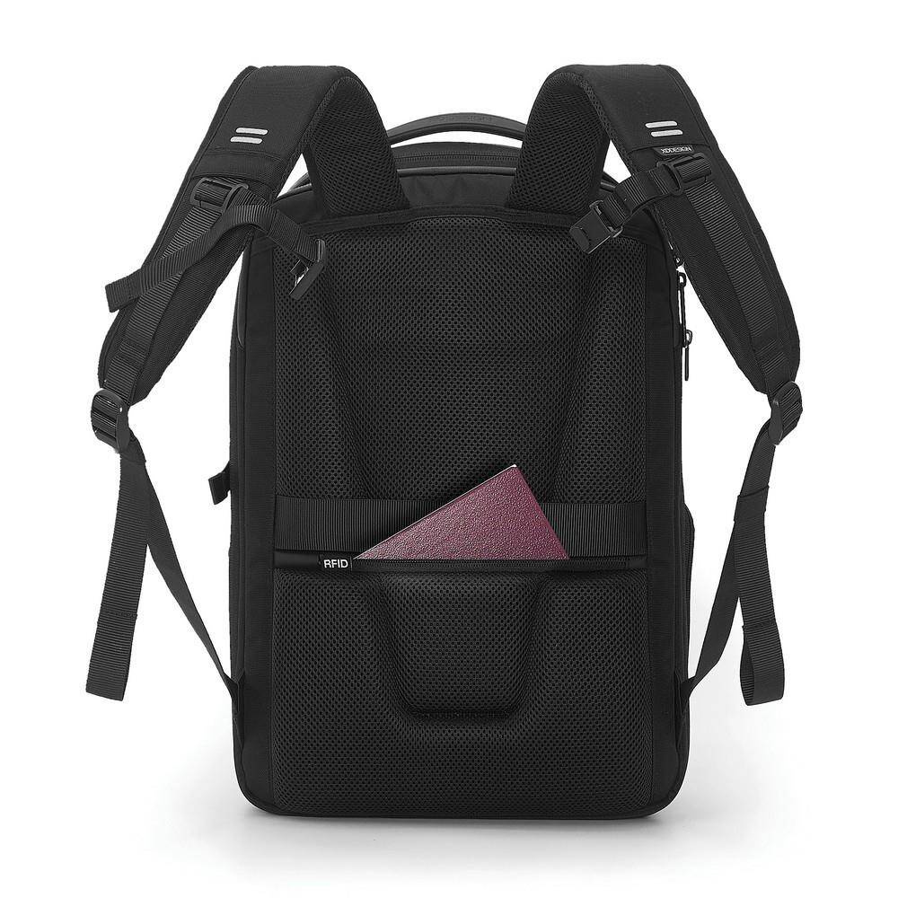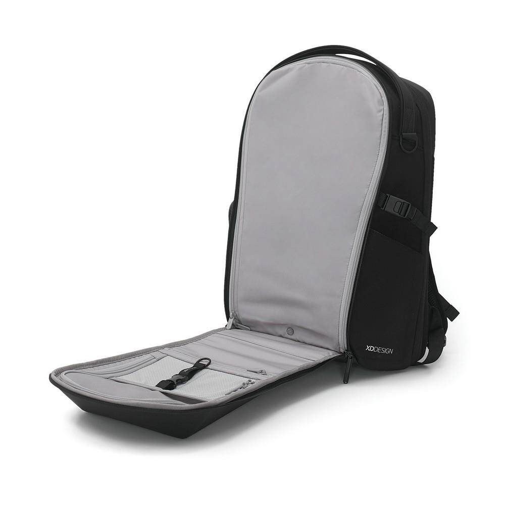Plecak na laptopa do 16”, przegroda główna otwierana pod kątem 180 stopni, wewnątrz kieszenie z siatki, wiele kieszeni na zewnątrz, kieszeń na butelkę zamykana na magnes, kieszeń z odpinaną smyczą na klucze, wodoodporny, wykonany z materiałów pochodzących z recyklingu, posiada wbudowany znacznik AWARE, który potwierdza wykorzystanie materiałów z recyklingu