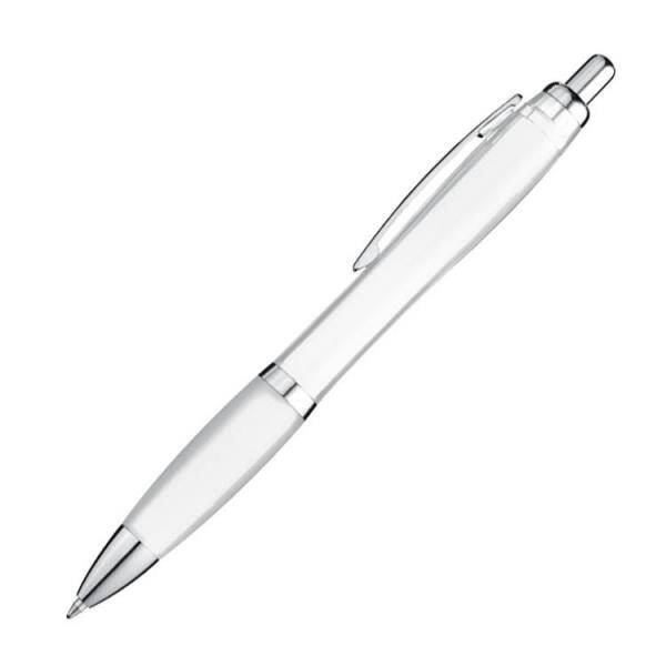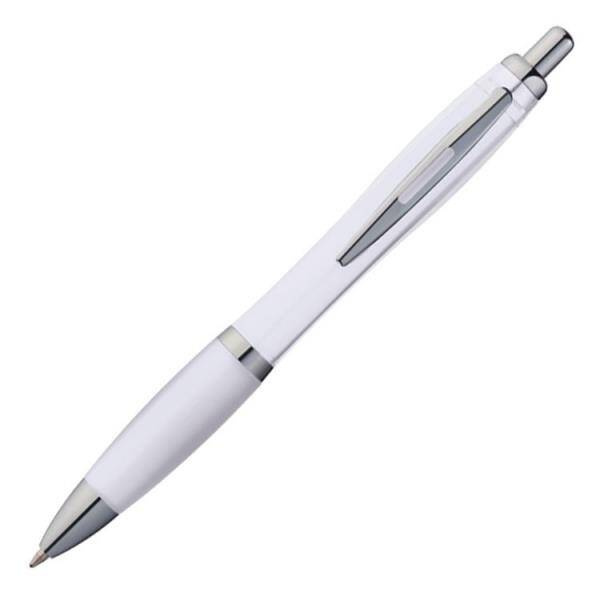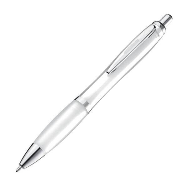 Długopis plastikowy z antypoślizgową gumką oraz z błyszczącymi elementami. Wyposażony w system typu kilk oraz wkład w kolorze niebieskim. Długopis dostępny w bogatej gamie kolorystycznej.