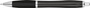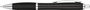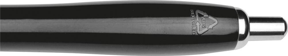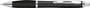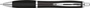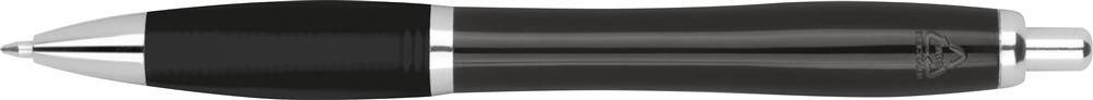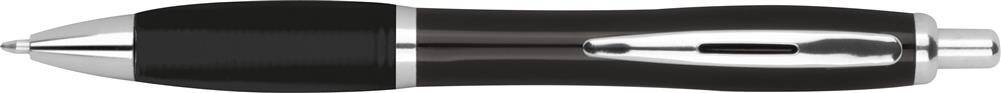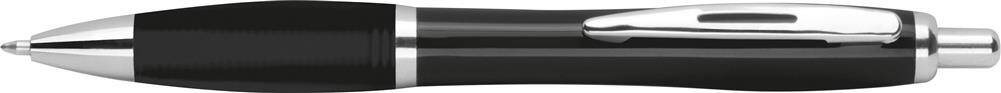 Plastikowy długopis z gumową strefą uchwytu oraz dużym niebieskim wkładem.