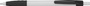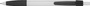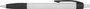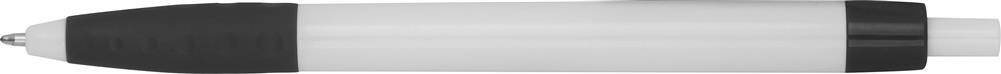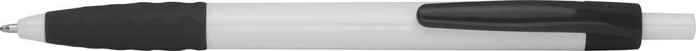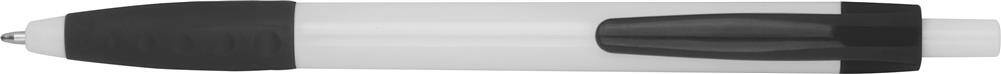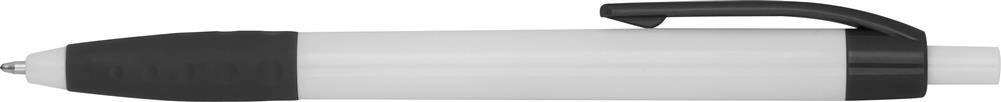 Plastikowy długopis z kolorowymi akcentami i gumową strefą uchwytu.