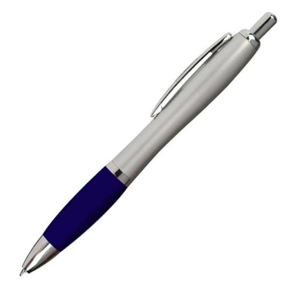 Długopis plastikowy z antypoślizgową gumką oraz z błyszczącymi elementami.