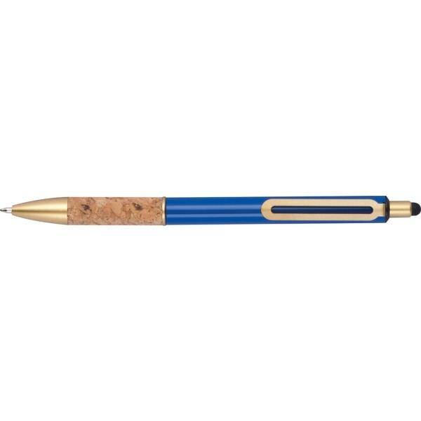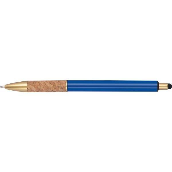 Metalowy długopis ze złotymi elementami i korkową strefą uchwytu.