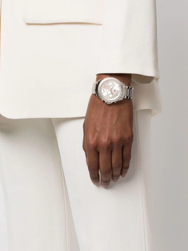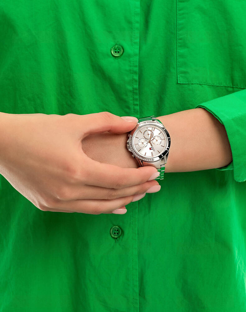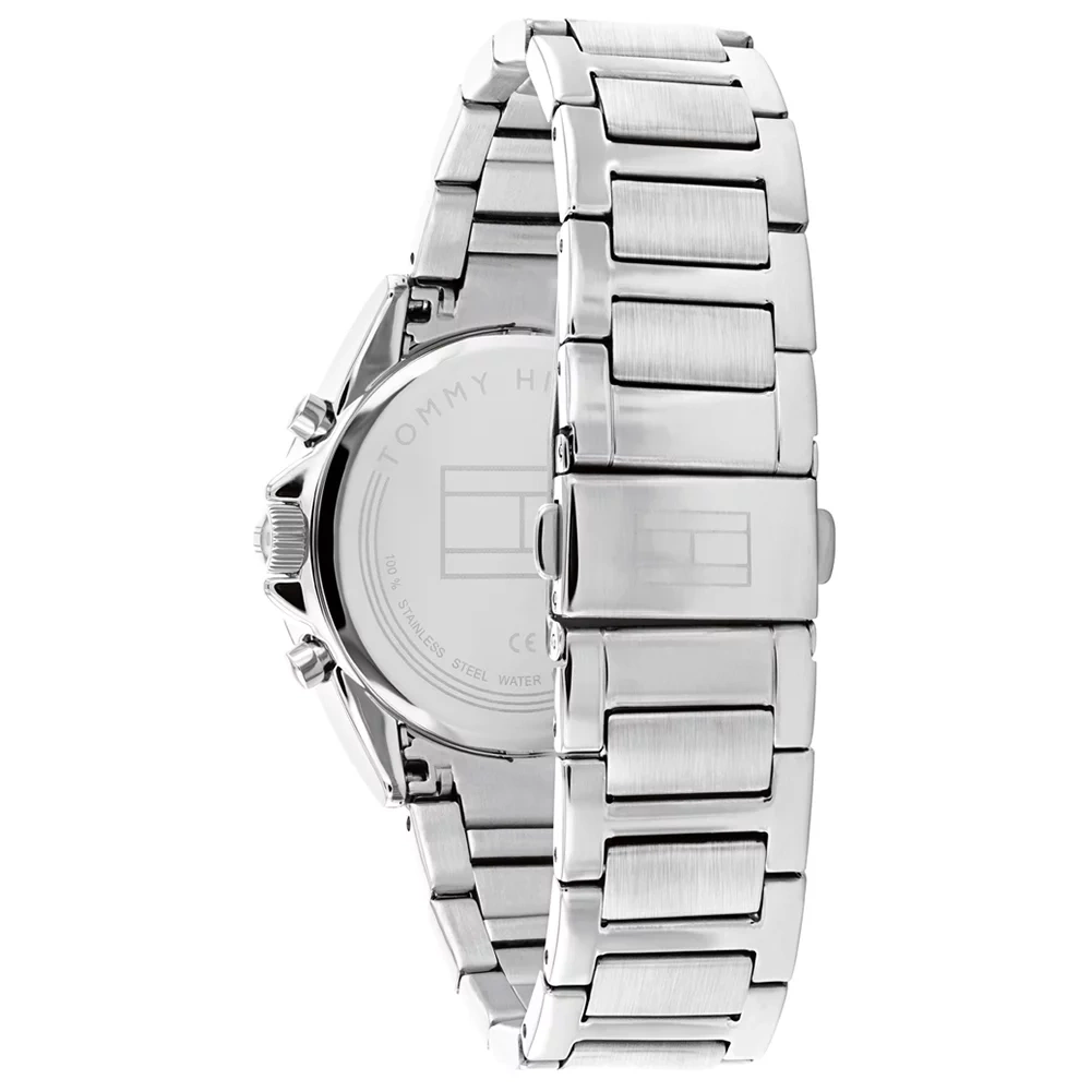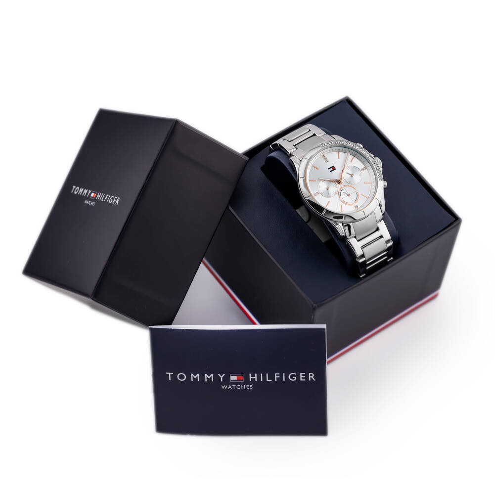 Zegarek Tommy Hilfiger Kennedy 1782384 to wyjątkowa propozycja od kultowej już marki, będąca odzwierciedleniem najgorętszych trendów. Ten elegancki damski czasomierz zasilany niezawodnym kwarcowym mechanizmem. Koperta oraz bransoleta zostały wykonana ze stali szlachetnej, co gwarantuje jej wieloletnią odporność na zniszczenie. Całość jest utrzymana w kolorze srebrnym, kontrastującym elementem jest srebrna tarcza ozdobiona szlifem słonecznym, który nadaje nowoczesnego industrialnego charakteru. Ponadto model ten jest nie tylko ładny ale i funkcjonalny, posiada trzy subtarcze: dni tygodnia, dni miesiąca oraz czas 24H. Wodoszczelność rzędu 5 ATM, gwarantuje ochronę nawet podczas kąpieli..