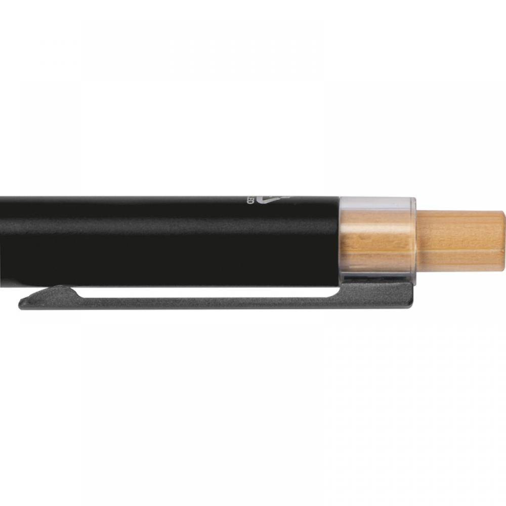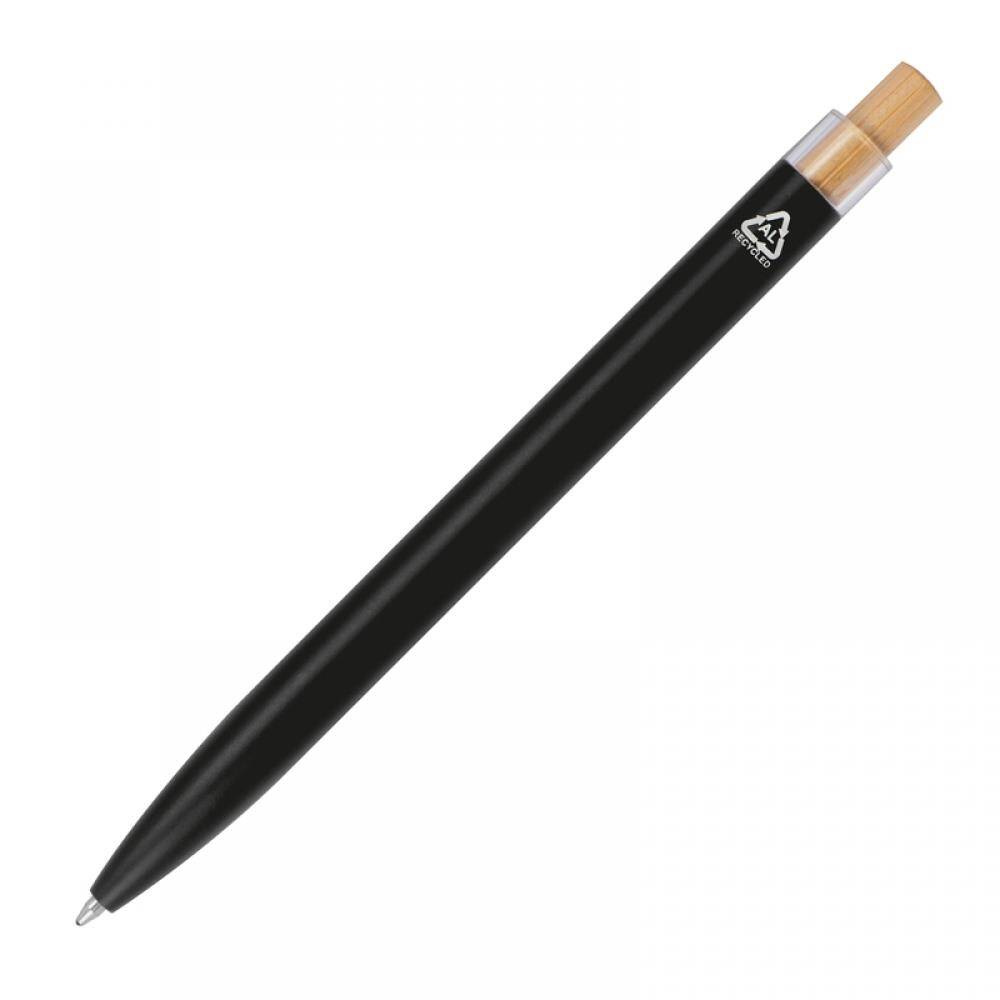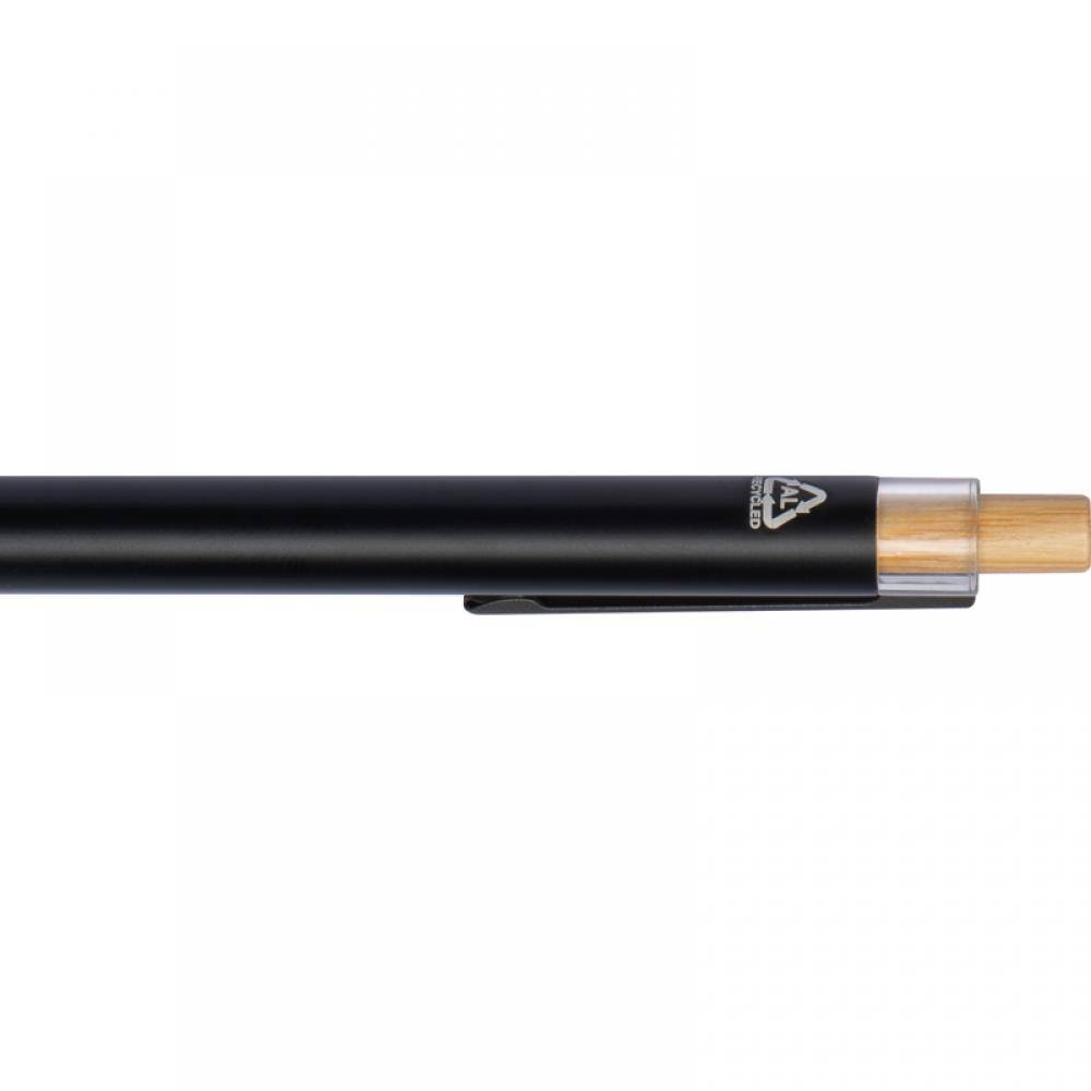 Długopis wykonany z aluminium pochodzącego z recyklingu, z niebieskim wkładem i bambusowym przyciskiem.