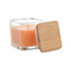 Zapachowa świeca woskowa na bazie roślin w kwadratowym szklanym pojemniku z bambusową pokrywką. 50 gr. Czas palenia: 8 godzin. Biały (06) zapach waniliowy, żółty (08) zapach cytrynowy, pomarańczowy (10) zapach pomarańczowy, zielony (48) zapach jabłkowy.