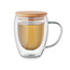 Kubek z podwójnymi ściankami ze szkła borokrzemowego z uchwytem i bambusową pokrywką.