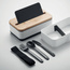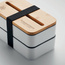 Dwupoziomowy pojemnik na lunch z PP z z wyjmowaną przegrodą i 3 sztućcami, z dołączoną opaską poliestrową, z bambusową pokrywą.